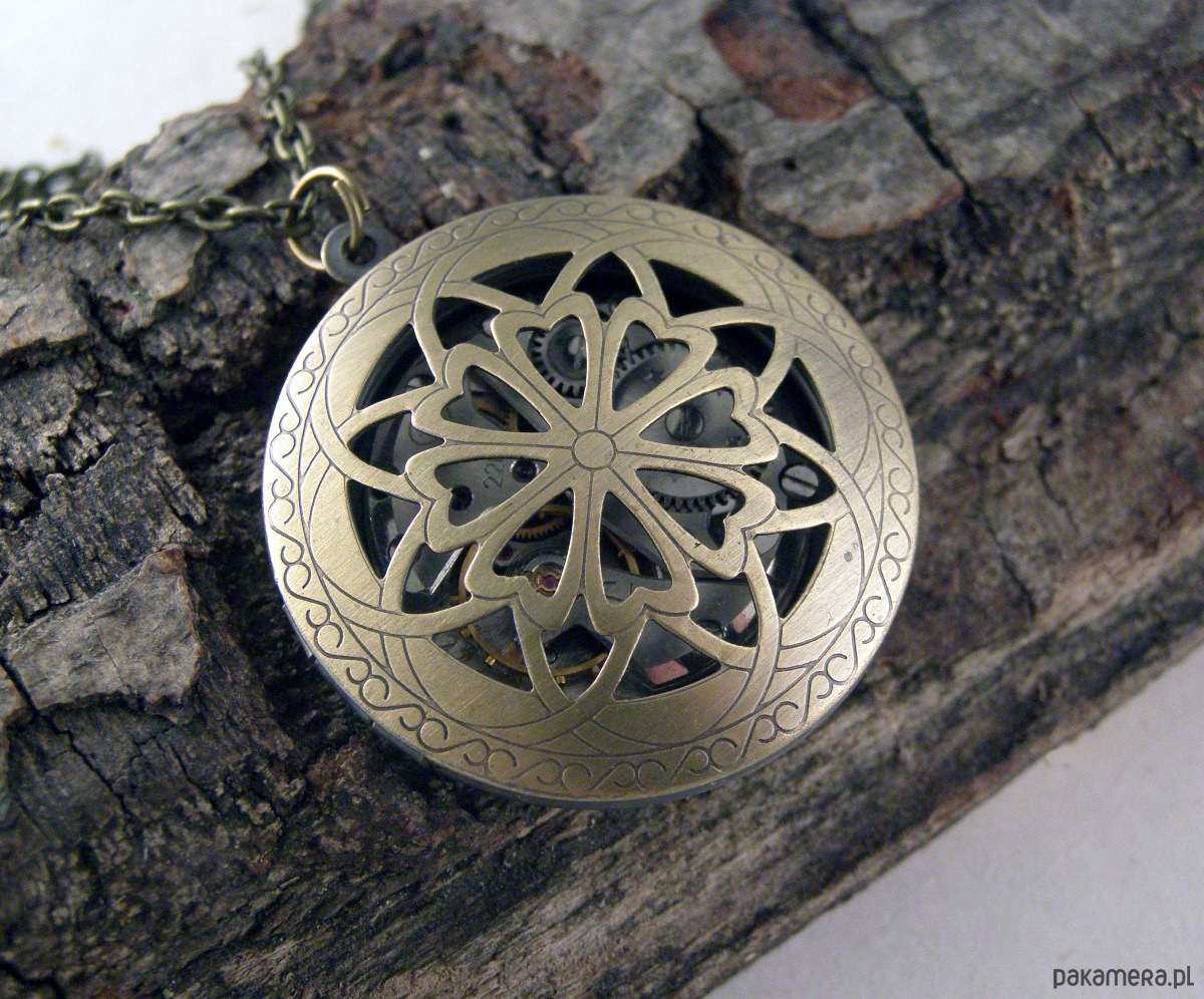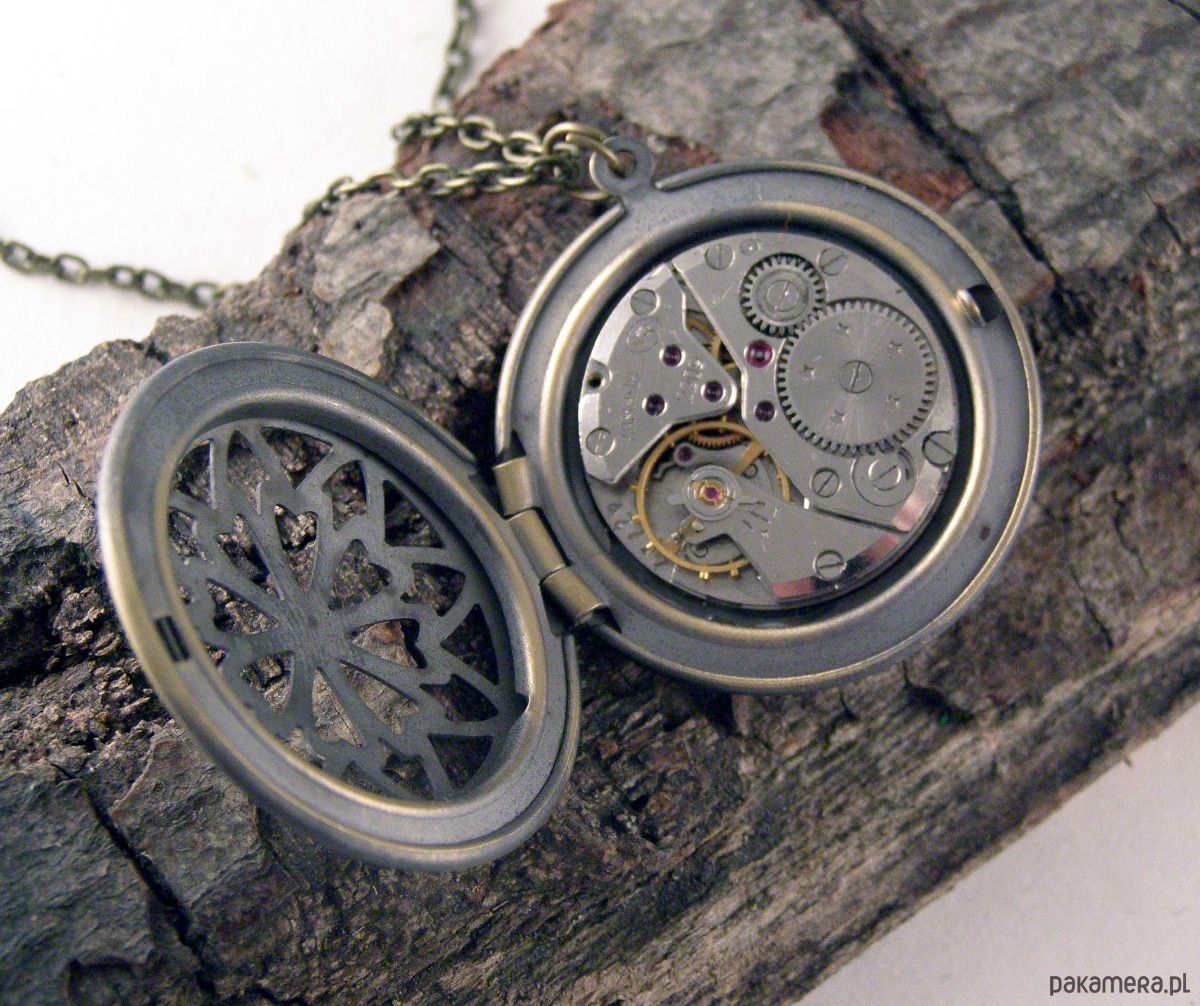 Sekretnik z mosiądzu, kryjący w środku mechanizm zegarkowy. Wewnątrz miejsce na 2 zdjęcia, co pozwala stworzyć osobisty, unikatowy detal biżuterii.