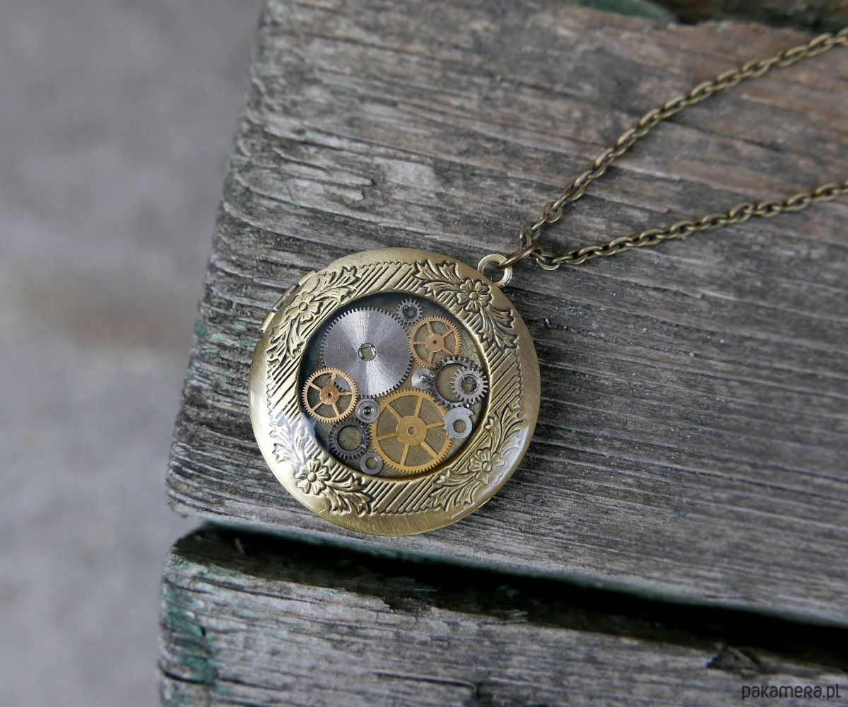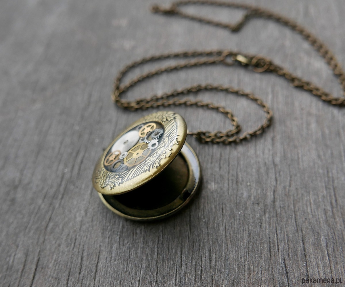 Delikatny naszyjnik, łączący mosiądz, żywicę i detale mechanizmu zegarka, w którym znajduje się miejsce na dwa zdjęcia. To wyjątkowy, personalizowany dodatek, który pozwala nosić przy sobie ulubione wspomnienia. Idealny na prezent lub pamiątkę.