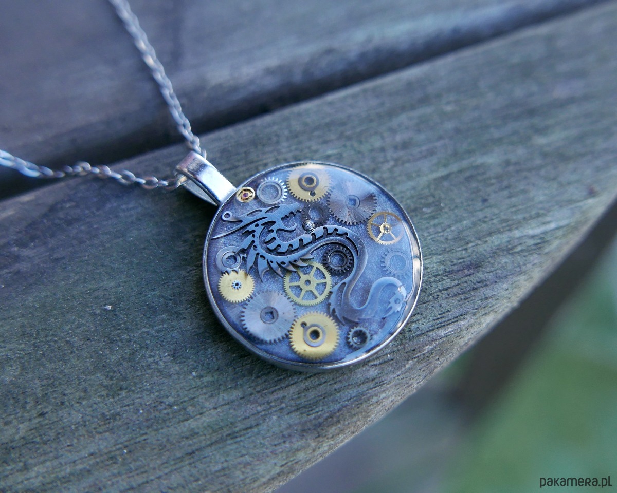 Pierwszy naszyjnik ze "smoczej" linii. Oprawa ze stali chirurgicznej, szara emalia i zatopione w żywicy elementu mechanicznego zegarka.