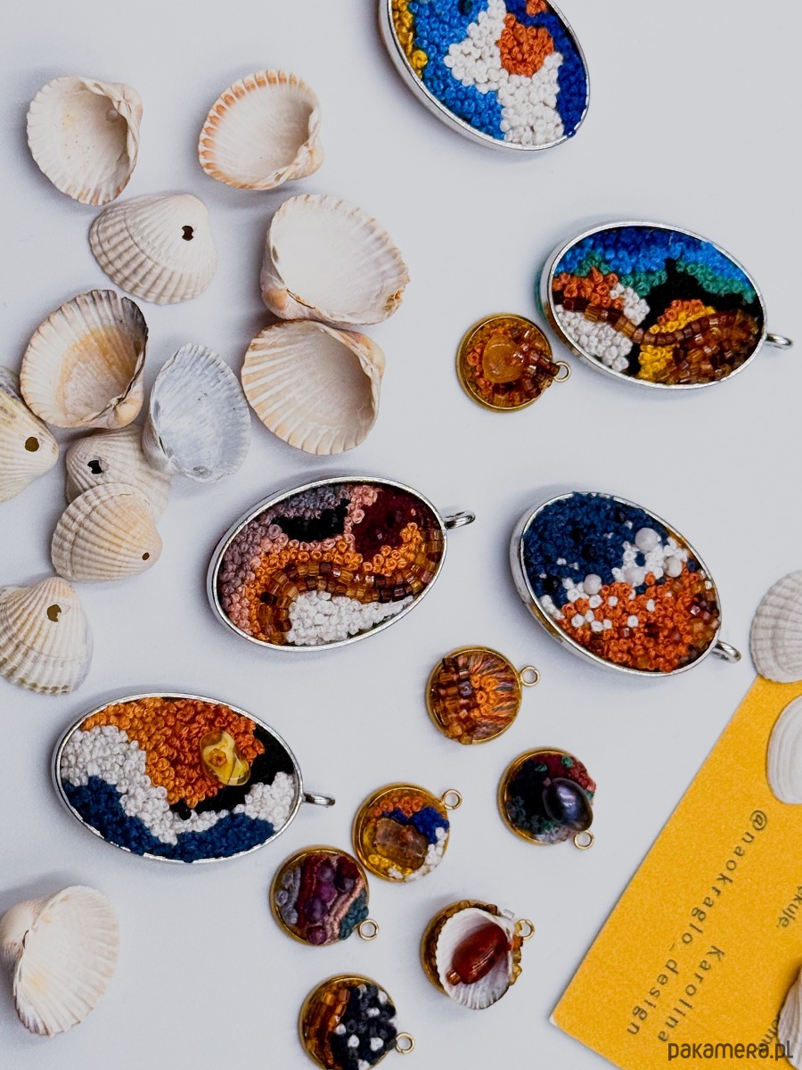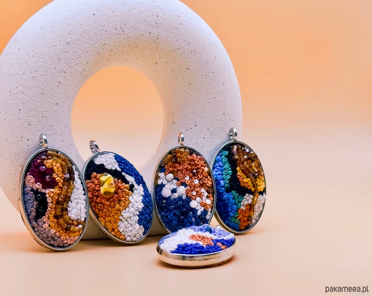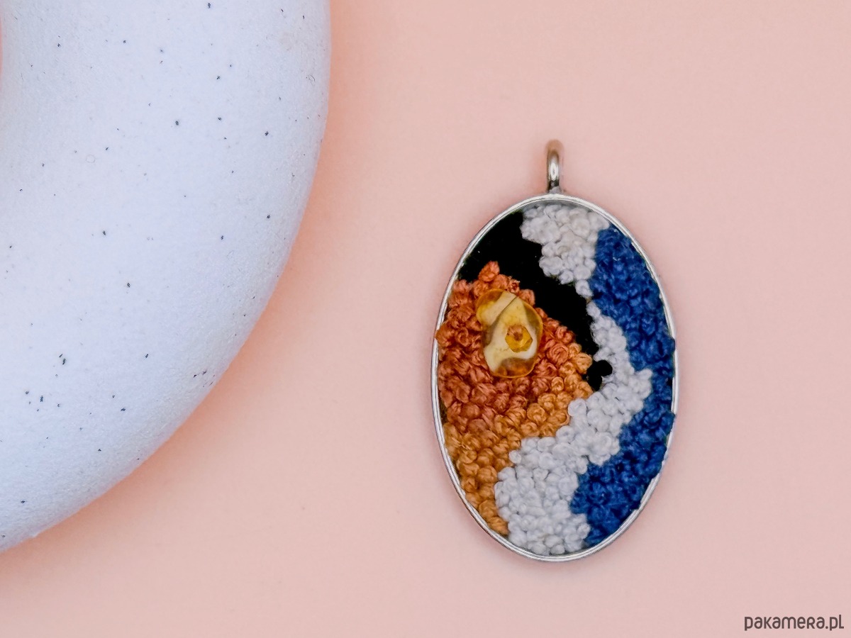Ten medalion powstawał powoli – ścieg po ściegu. Drobne ściegi nici tworzą strukturę przypominającą ruch fal i przenikanie się barw. Bursztyn wpleciony w geometrię piasku odbija światło, łapiąc spojrzenia. Ten amulet wiele mówi o właścicielu. Jest minimalistyczny, jednak dzięki bursztynowi i układowi kolorów zapada w pamięć i przywodzi na myśl stabilność oraz naturalność. To mały fragment nadmorskiej opowieści.