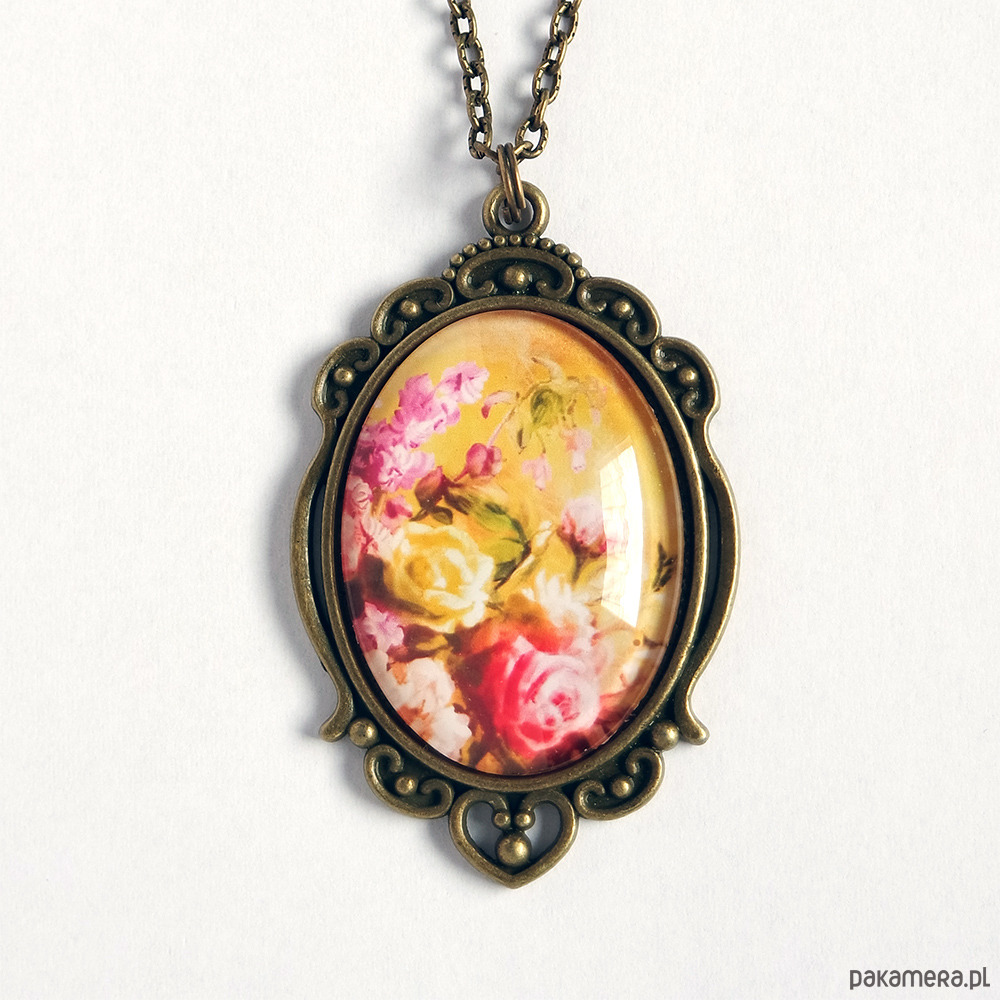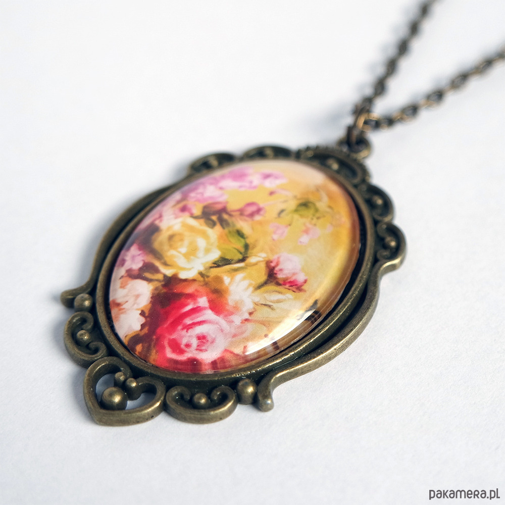Grafika ukryta w romantycznym, pięknie zdobionym medalionie, pod osłoną przeźroczystego półokrągłego szkiełka.