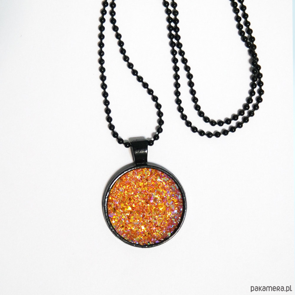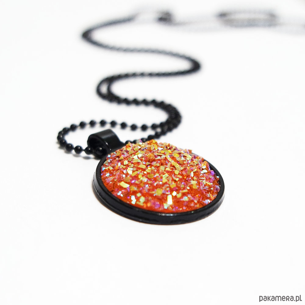 Niezwykły naszyjnik z kaboszonem z żywicy - druzy, mieniący się w wielu odcieniach m.in. pomarańczowym, łososiowym, różowym i złotym.