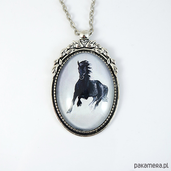 Medalion, naszyjnik - Czarny koń - zdobiony, owalny