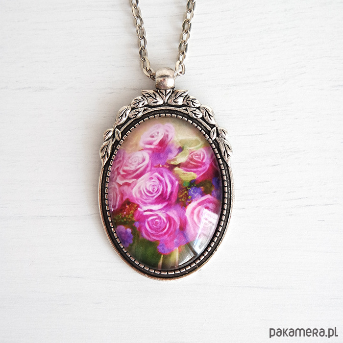 Medalion, naszyjnik - Różowe róże - zdobiony, owalny