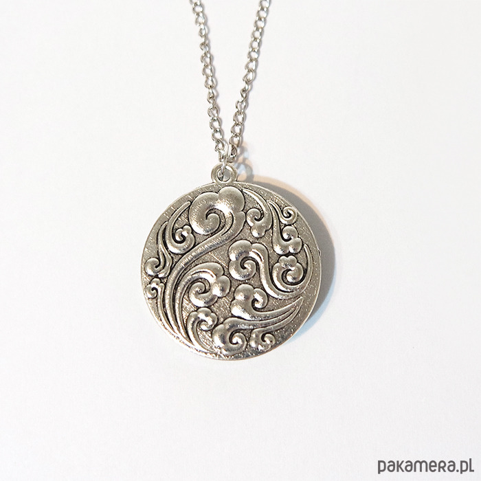 Grafika ukryta w romantycznym medalionie, pod osłoną przeźroczystego półokrągłego szkiełka.