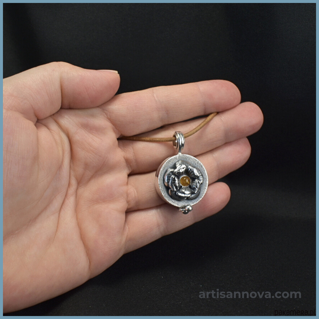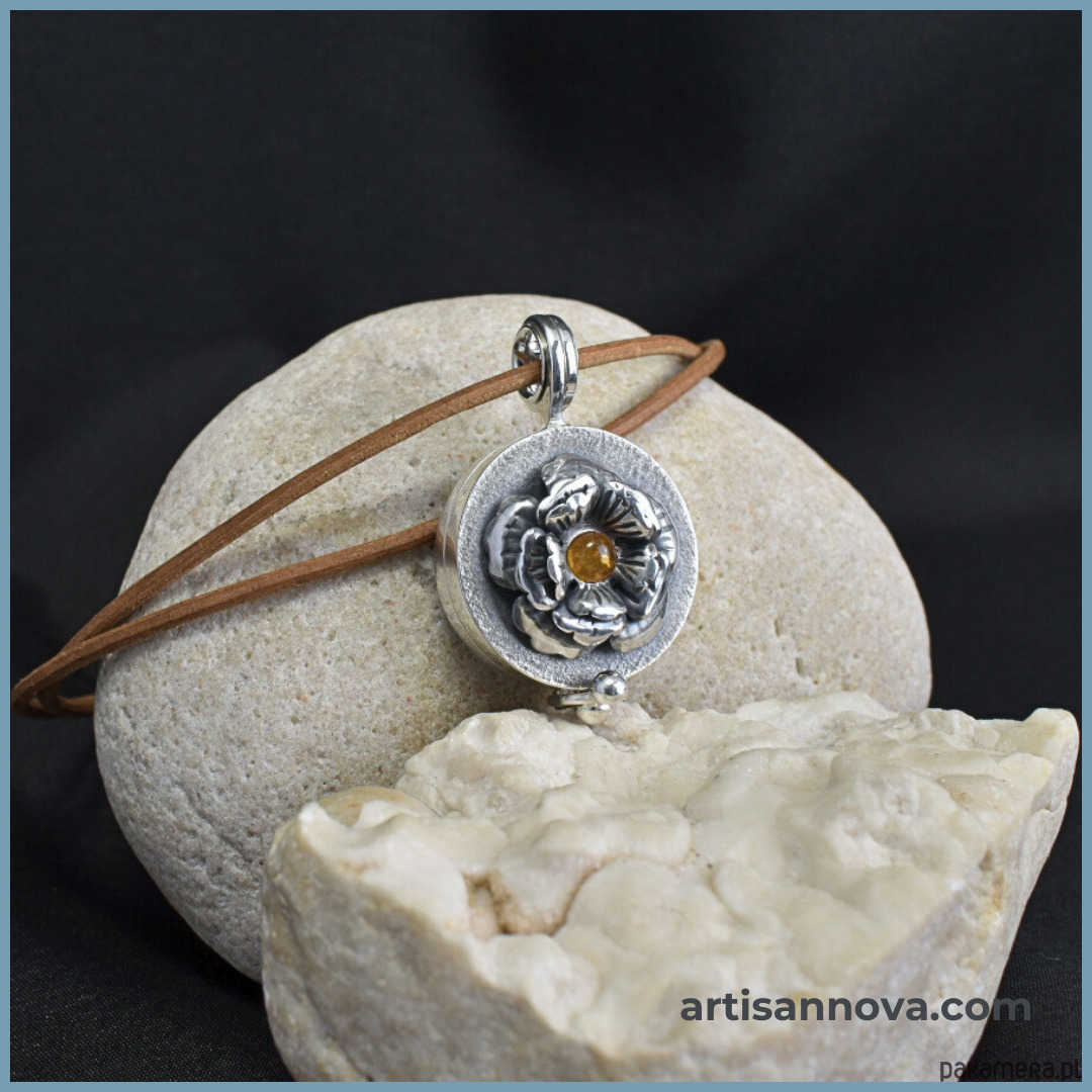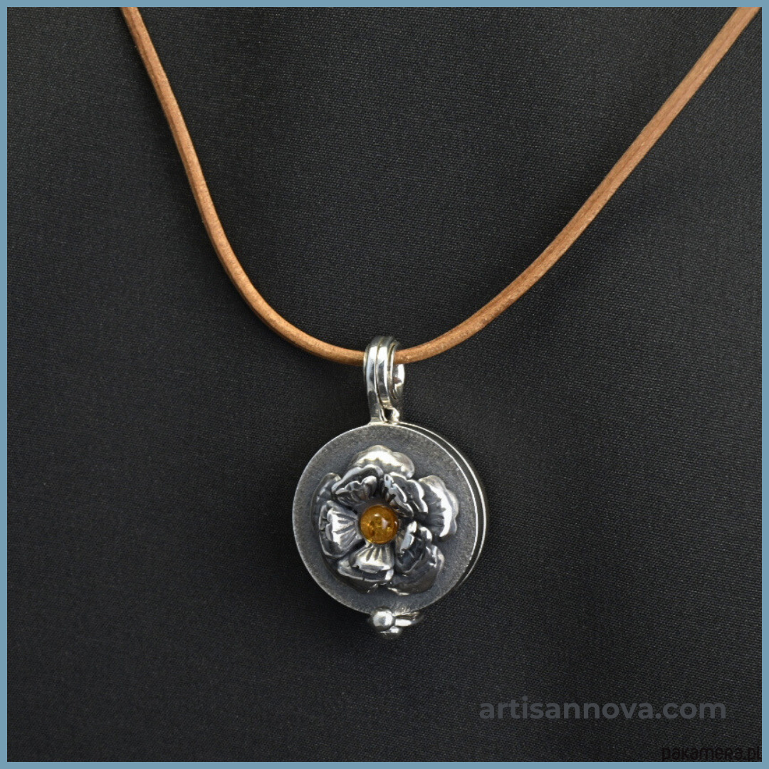 Front medalionu zdobi ręcznie wykonany, wielowymiarowy kwiat. W jego centrum osadzony został niewielki bursztyn bałtycki, którego ciepła barwa kontrastuje z przyciemnioną powierzchnią srebra.