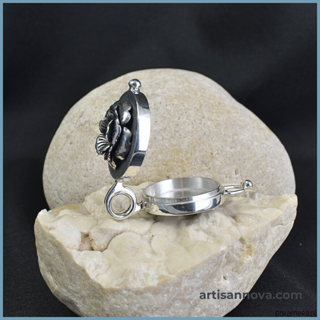 Ten medalion jest otwieranym sekretnikiem zaprojektowanym jako biżuteria, która pozwala przechowywać w swoim wnętrzu drobny przedmiot osobisty lub fotografię.
