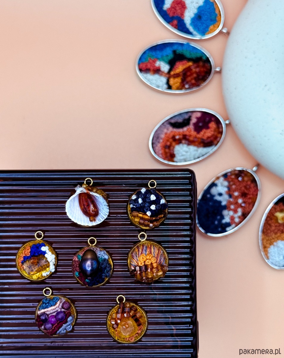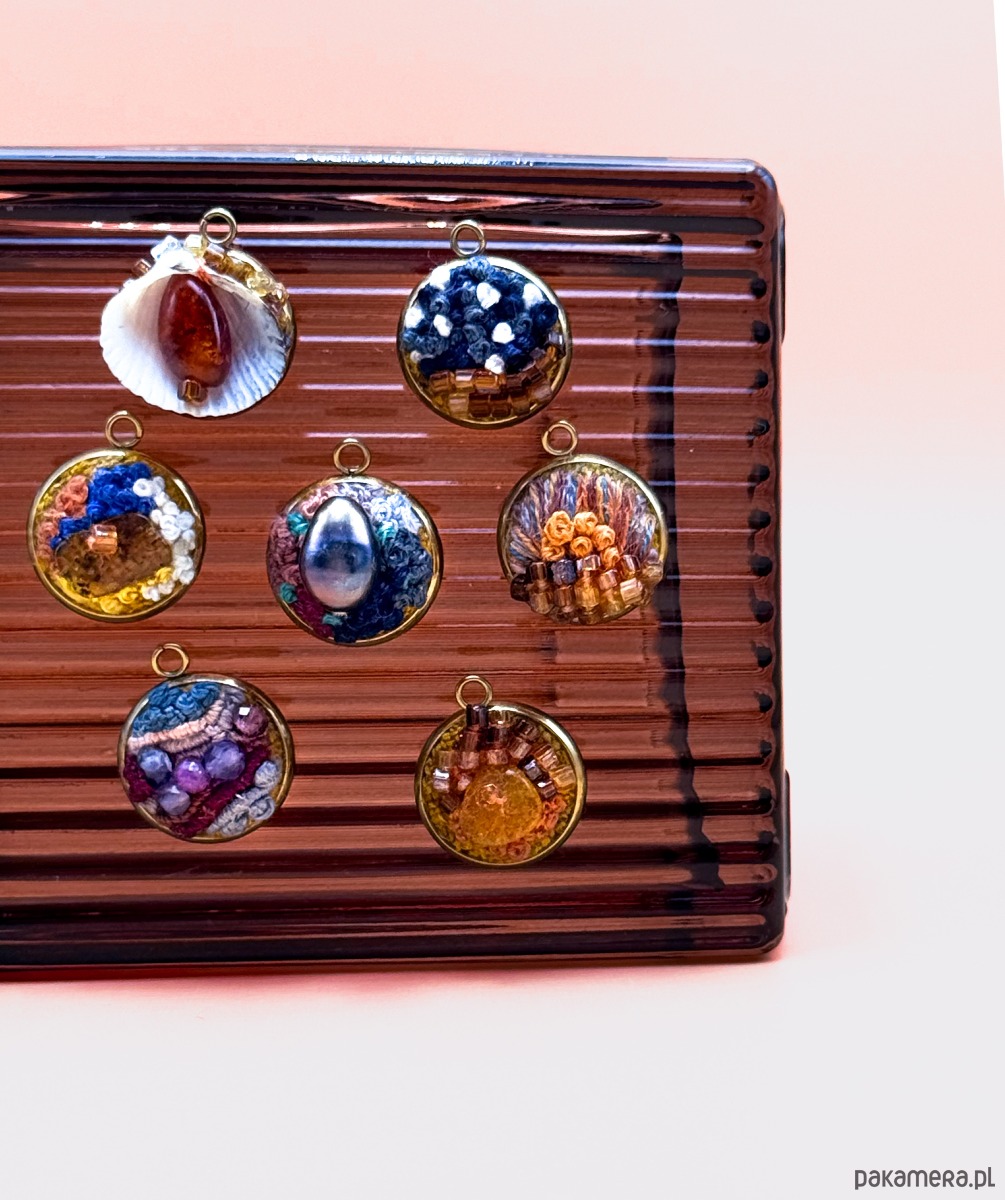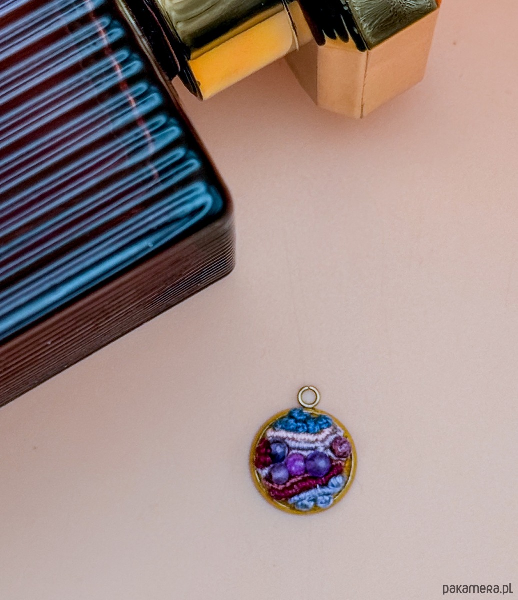 Ten medalion powstawał powoli – ścieg po ściegu. Drobne kamienie naturalne i nici tworzą strukturę przypominającą ruch fal i przenikanie się barw. Fiolety które dominują w medaliku wzmacniają intuicję, pozwalają się odprężyć i zrelaksować - jak przy zachodzie słońca odbijającego się w falach. To mały fragment nadmorskiej opowieści.
