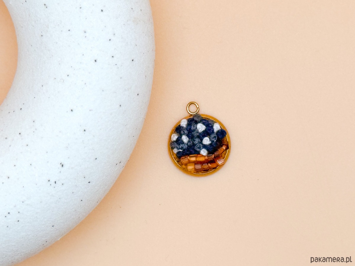 Ten medalion powstawał powoli – ścieg po ściegu. Drobne ściegi nici tworzą strukturę przypominającą ruch fal i przenikanie się barw. Bardzo drobne pomarańczowe koraliki kontrastują z ciemnym granatem wzburzonego morza. Pomarańcze w medaliku wzmacniają energię, ruch i kreatywność, granat zaś wzmacnia poczucie zaufania. To mały fragment nadmorskiej opowieści.