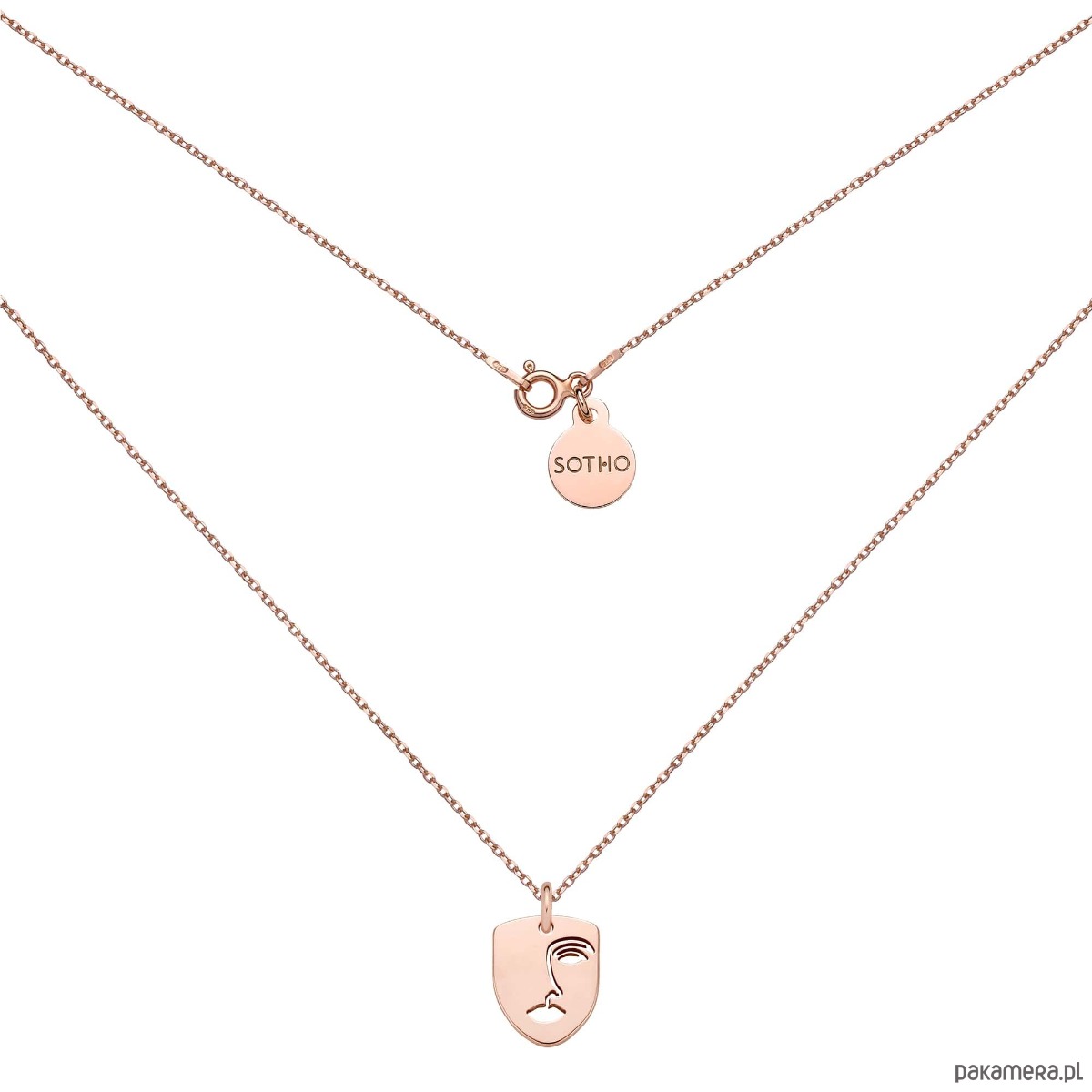 Złoty naszyjnik z medalionem Face N°6 i zawieszką z logo marki. Całość wykonana ze srebra 925 powlekanego 18 karatowym różowym złotem.