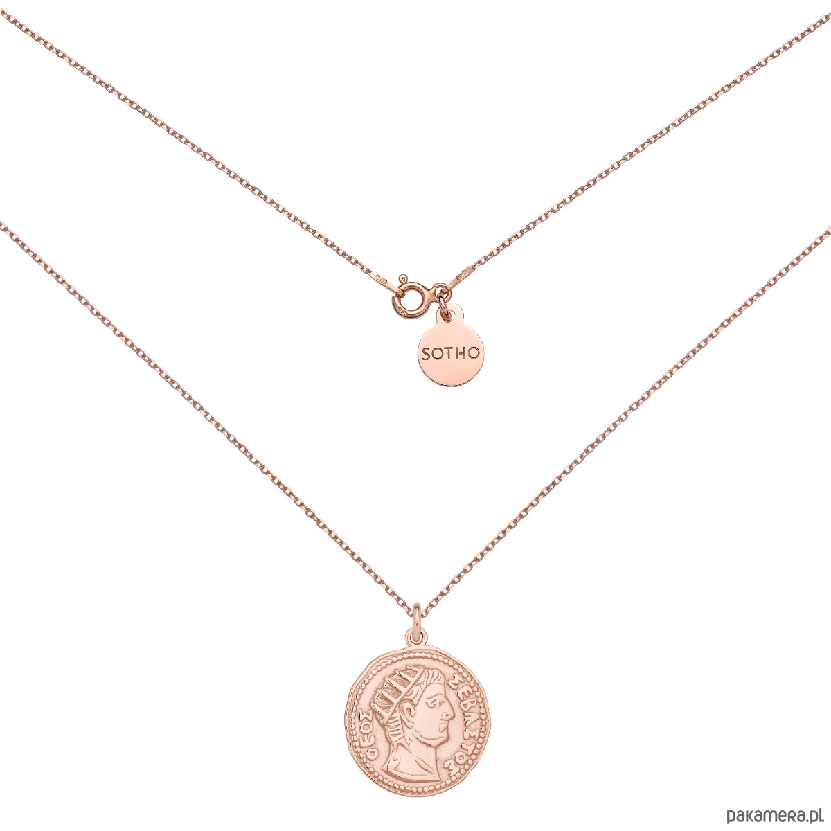 Złoty naszyjnik ze starą monetą i zawieszką z logo marki. Całość wykonana ze srebra 925 powlekanego 18 karatowym różowym złotem.