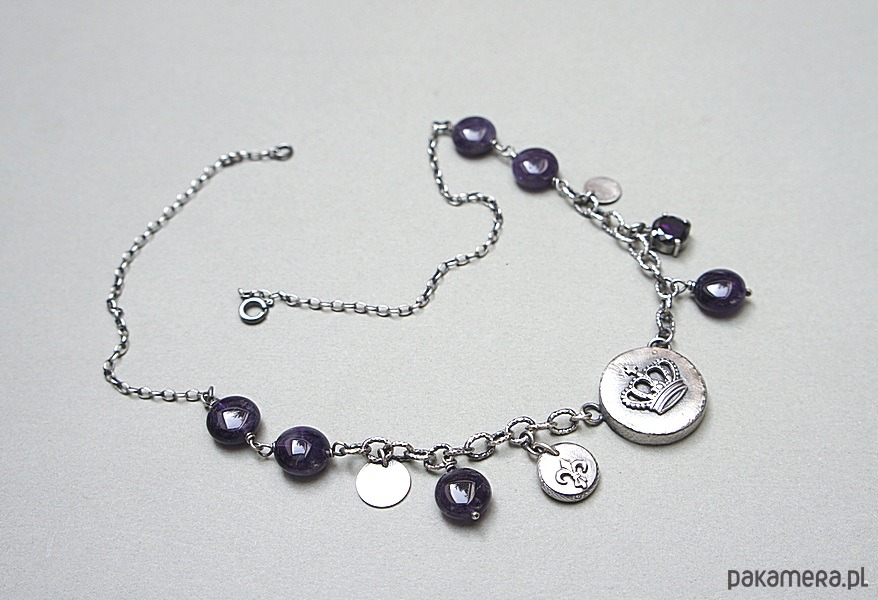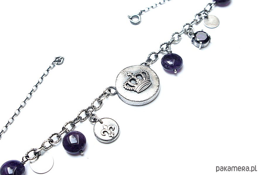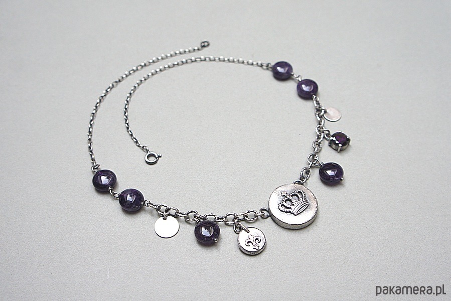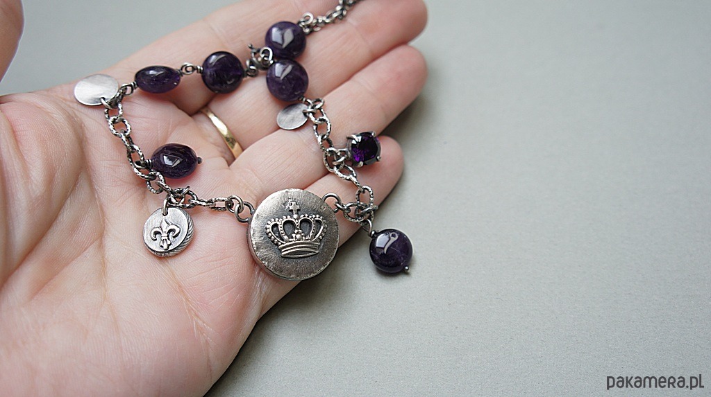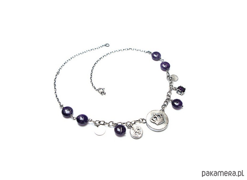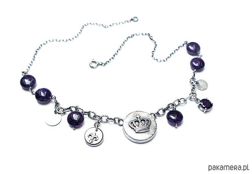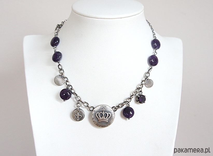 Naszyjnik wykonany ze srebra [pr. 925] w połączeniu z monetkami ametystów [10mm], cyrkonia [8mm] oraz własnoręcznie wykonanymi przestrzennymi zawieszkami. Całość oksydowana i przetarta. Całkowita długość naszyjnika 43,5cm. Biżuteria ozdobnie zapakowana.