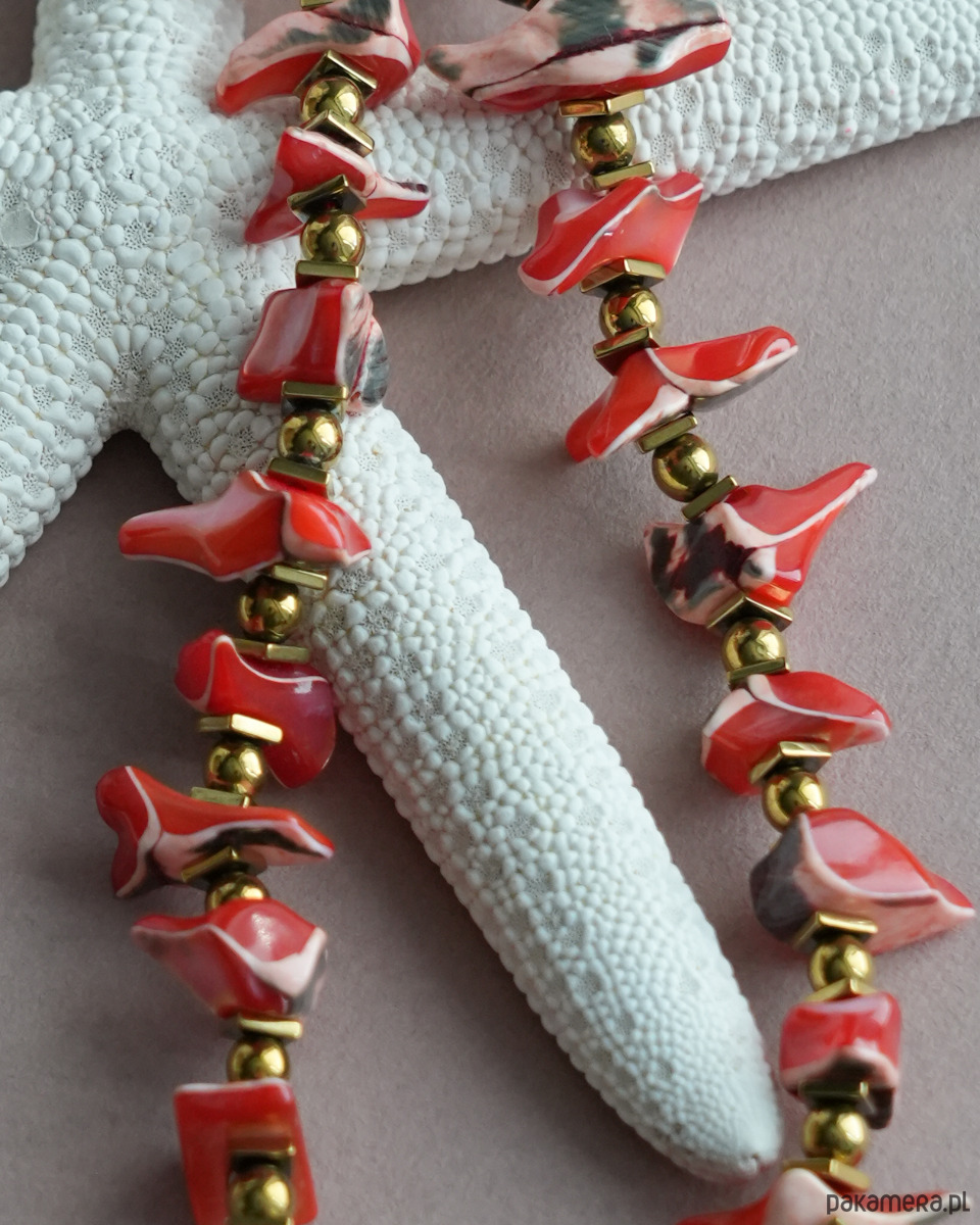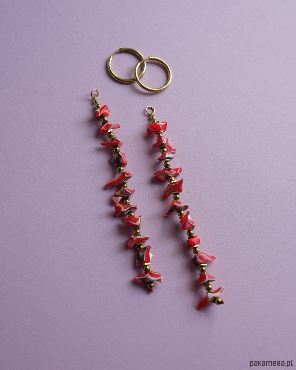 MEGA długie i bardzo efektowne kolczyki wykonane z kawałków MUSZLI barwionej na kolor czerwony oraz złotego HEMATYTU. Kolczyki są zawieszone na kółkach ze STALI SZLACHETNEJ w kolorze złotym.
