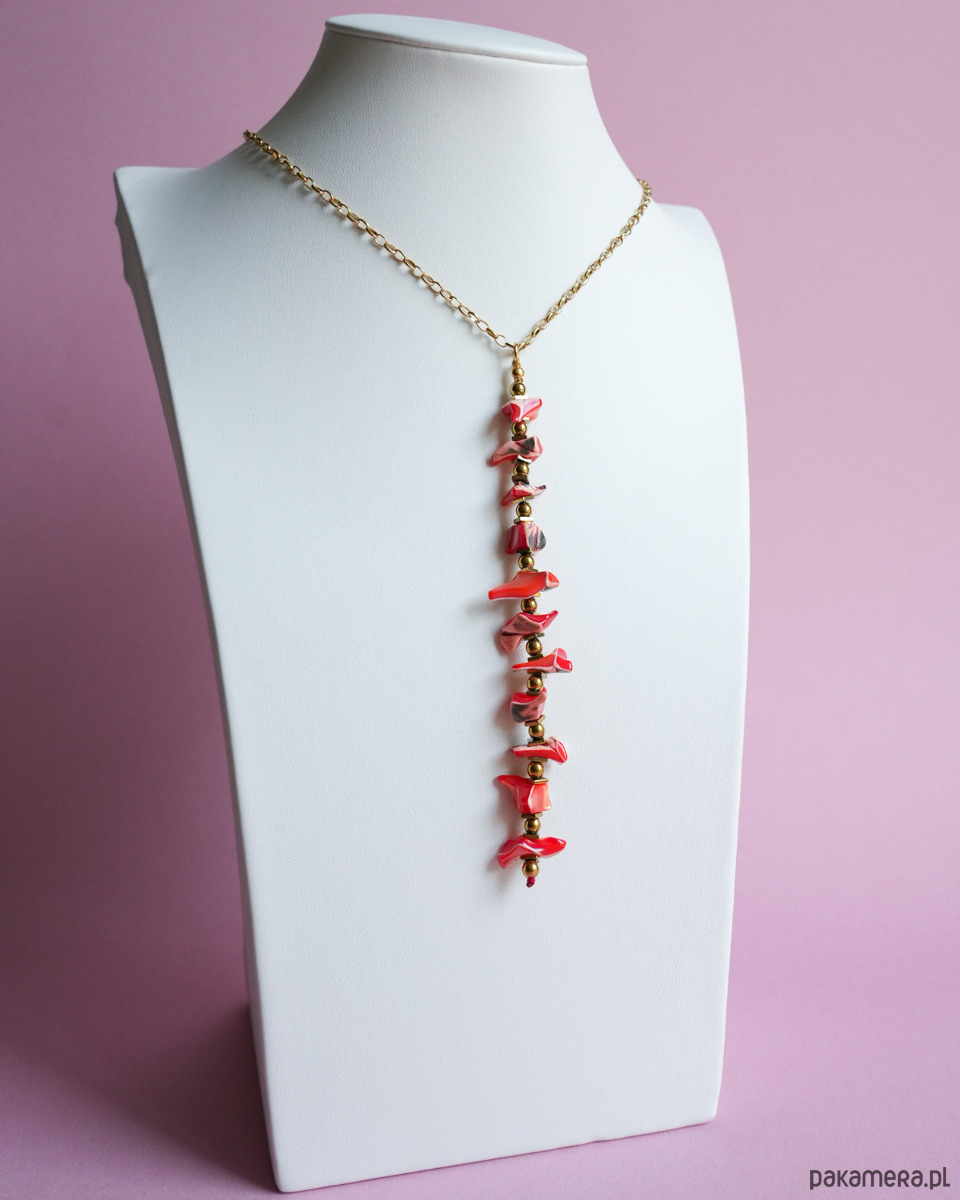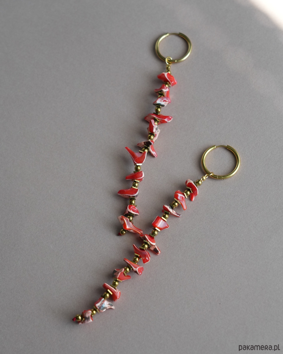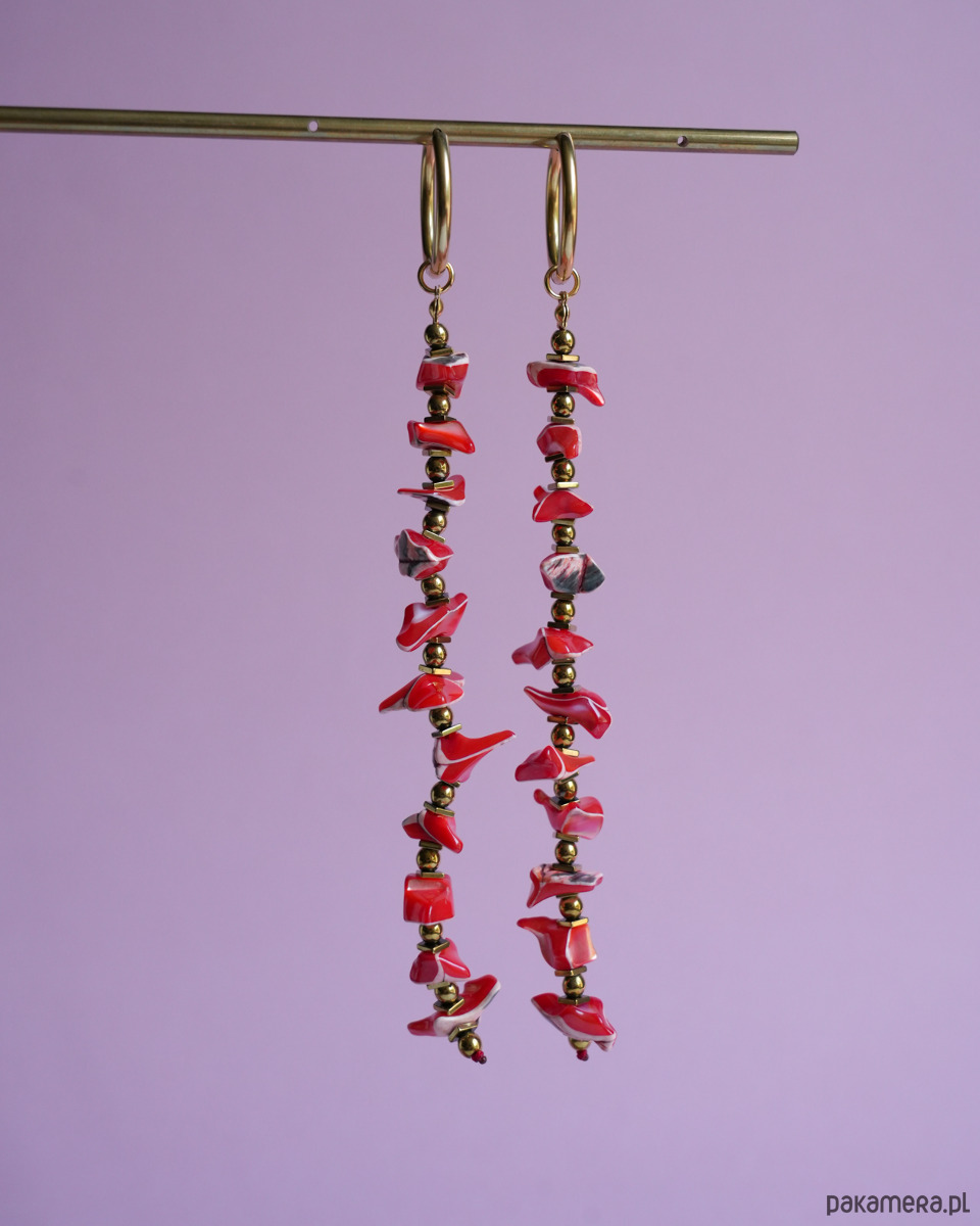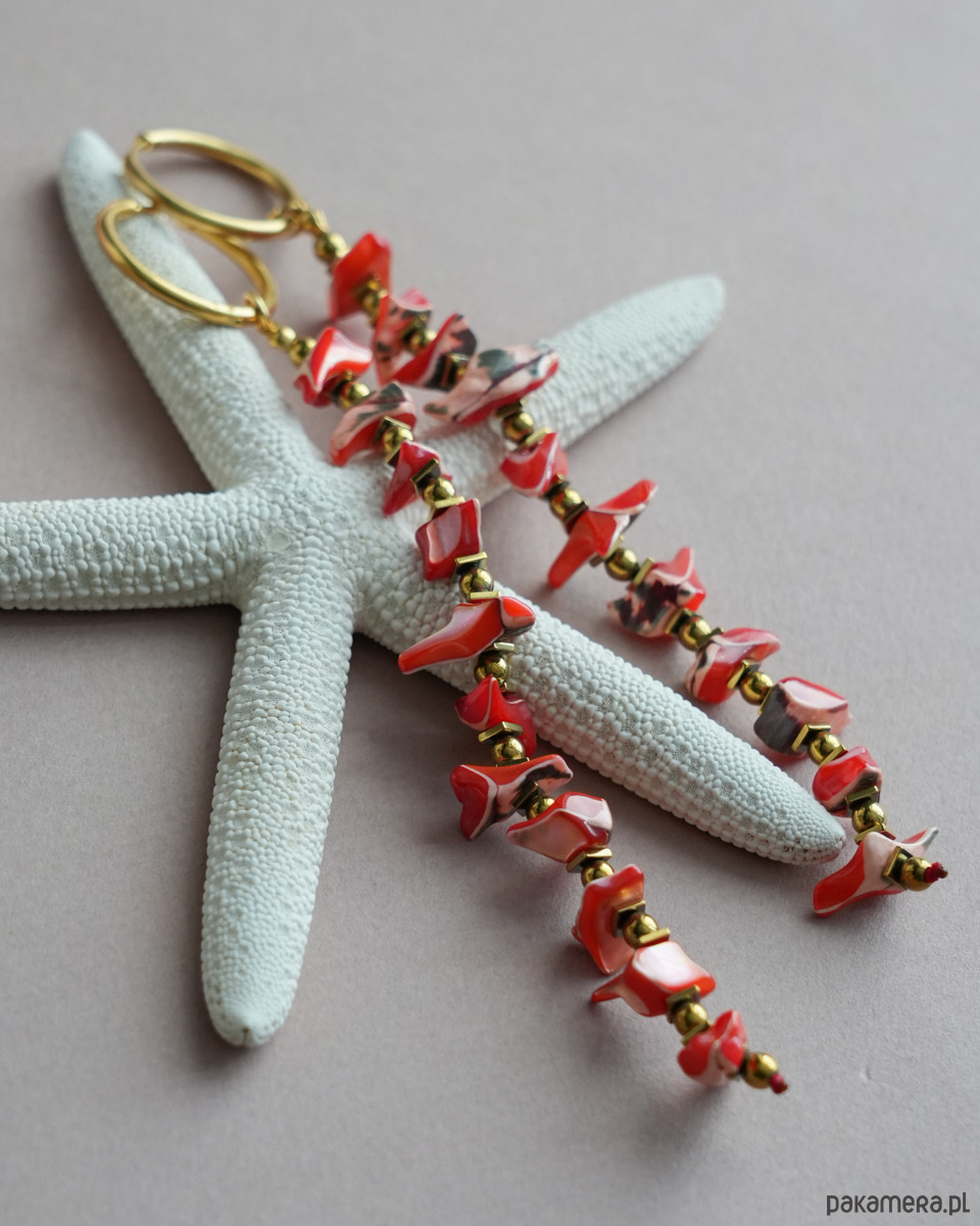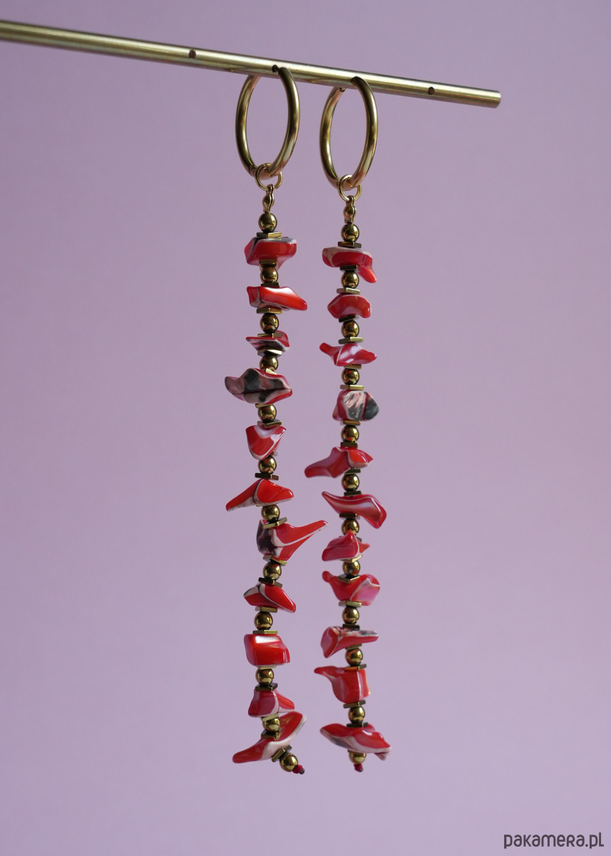 MEGA długie i bardzo efektowne kolczyki wykonane z kawałków MUSZLI barwionej na kolor czerwony oraz złotego HEMATYTU. Kolczyki są zawieszone na kółkach ze STALI SZLACHETNEJ w kolorze złotym.
