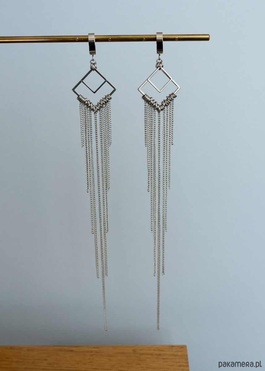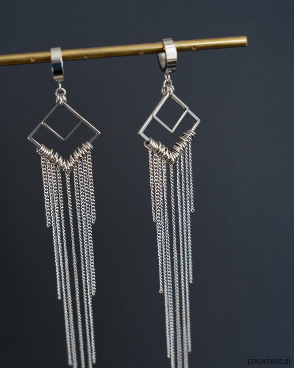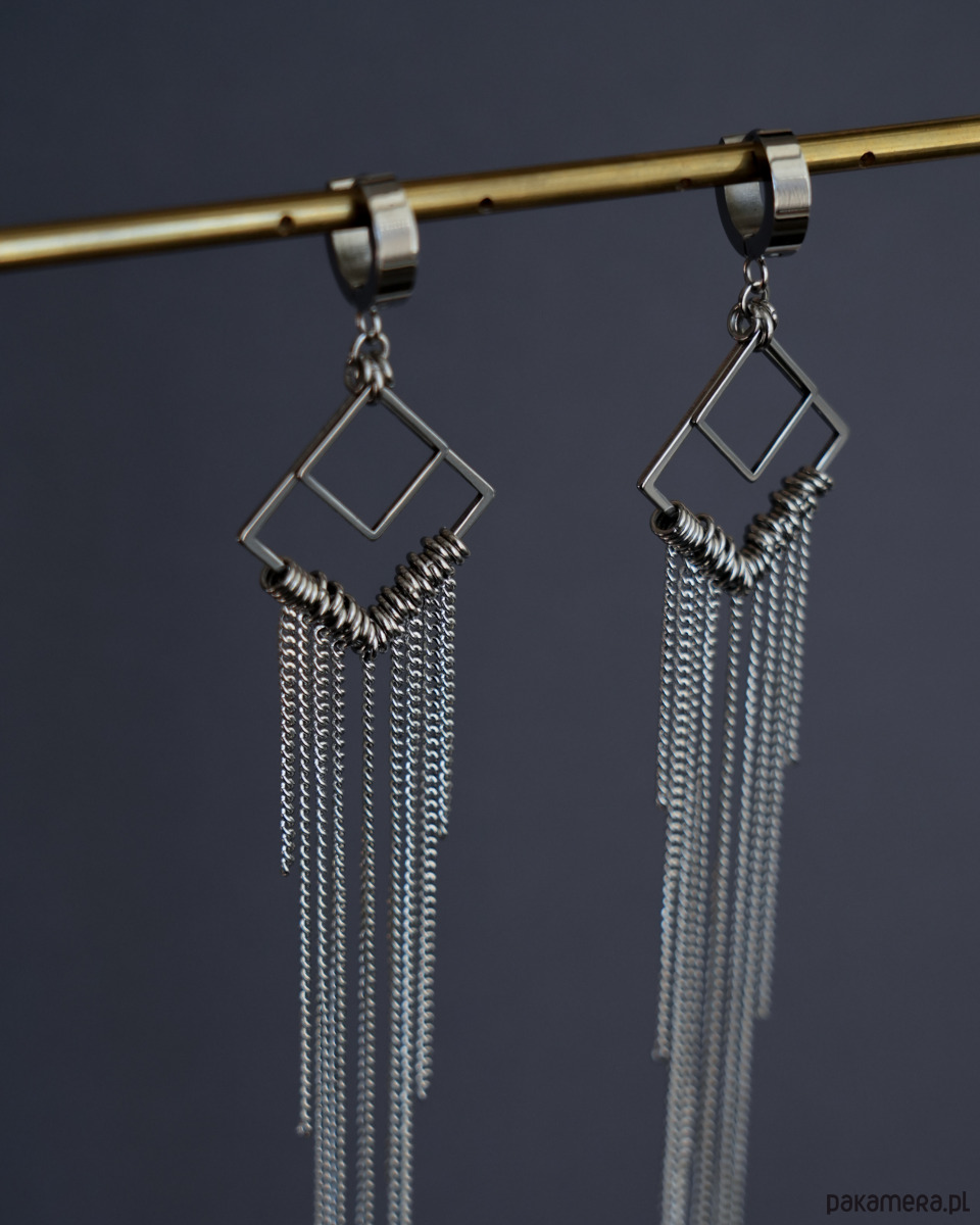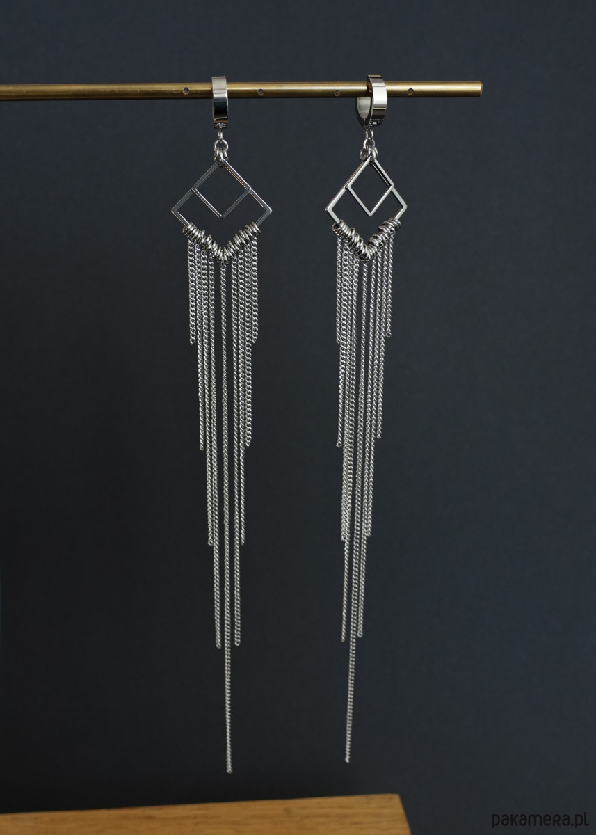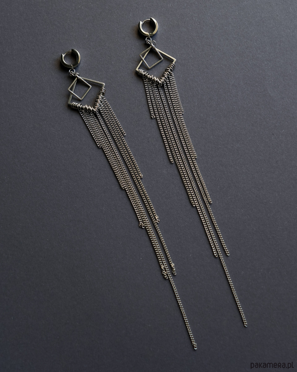MEGA długie kolczyki z łańcuszków, w całości wykonane ze stali szlachetnej. Extra dodatek do kreacji na imprezę. Dla kobiet, które lubią wyrazistą i rzucającą się w oczy biżuterię.