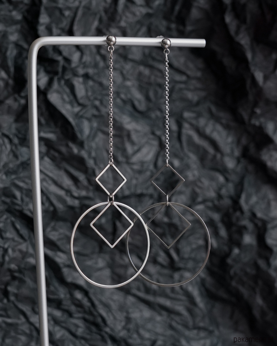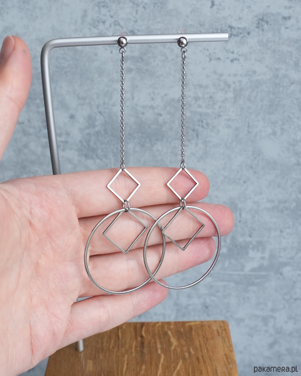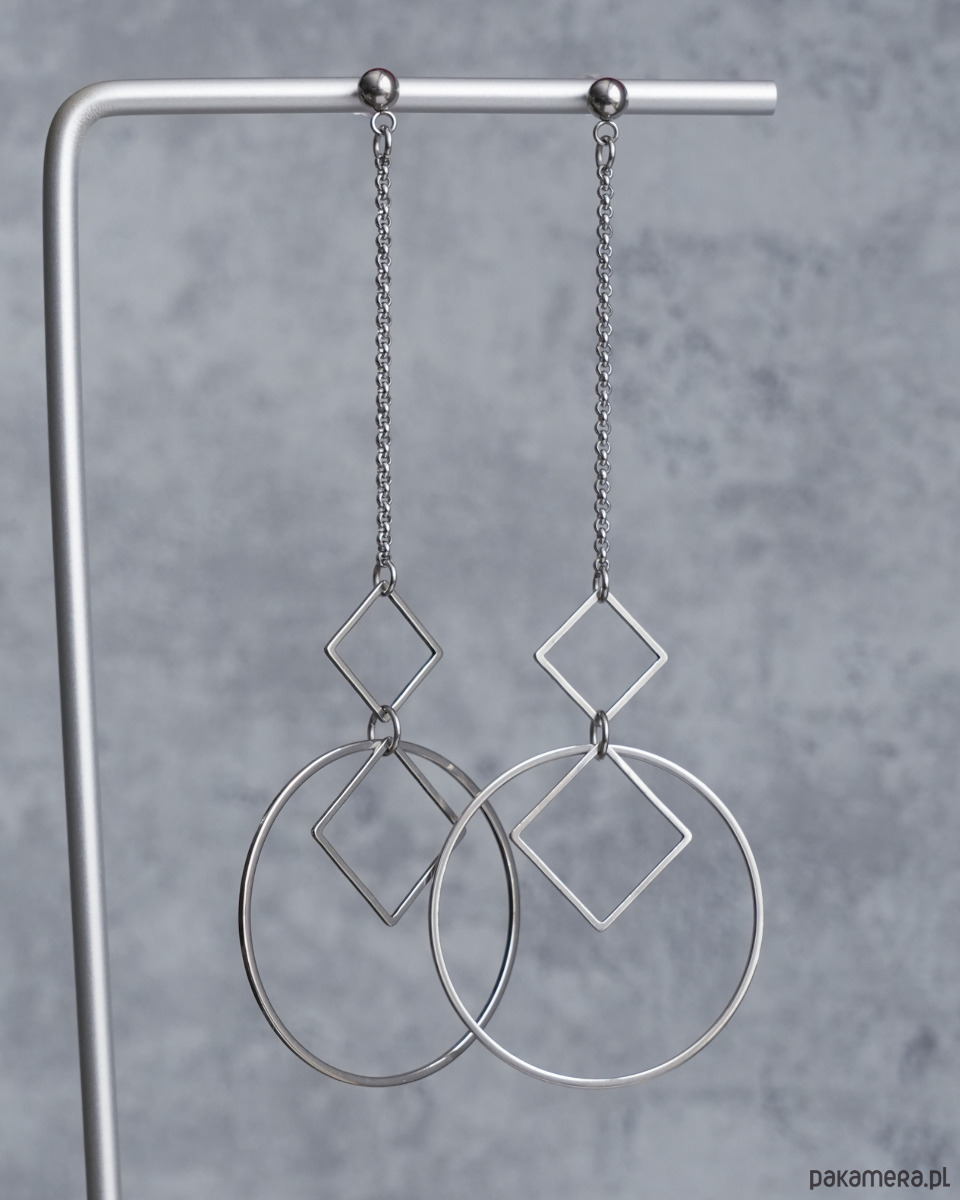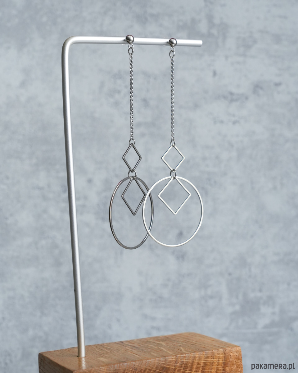 Bardzo długie i efektowne, nowoczesne, wiszące kolczyki geometryczne, zawieszone na klasycznych sztyftach z kulką. Mega oryginalne, na pewno będą przykuwać wzrok. Do noszenia na co dzień i na imprezę. Będą świetnie się prezentować np. do czarnego swetra lub bluzki z golfem.