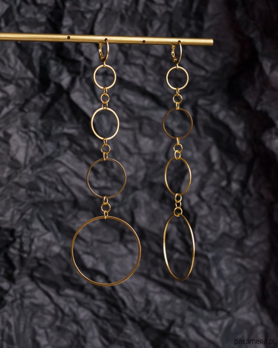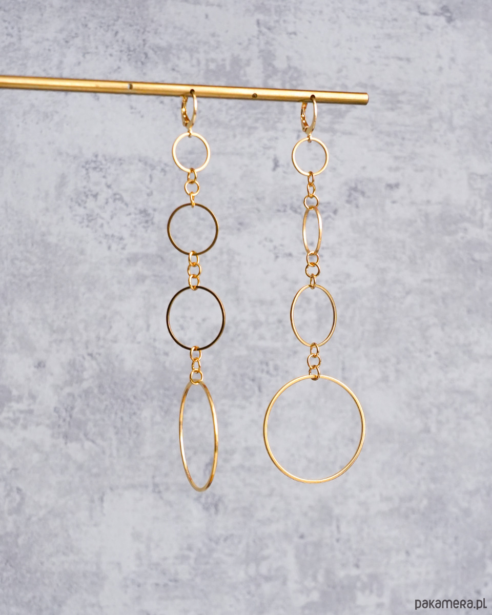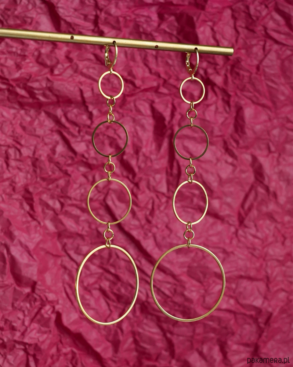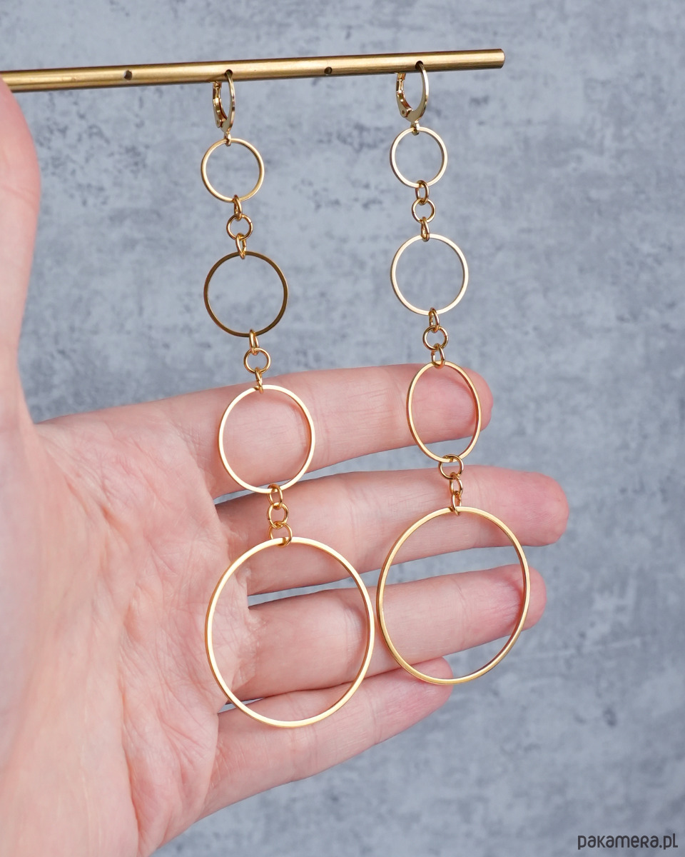 Bardzo długie, efektowne i nowoczesne, złote kolczyki z 4 kółkami różnej wielkości, zawieszone na zamykanych biglach typu "kajdanki". Kolczyki są w całości wykonane ze STALI SZLACHETNEJ w kolorze złotym.