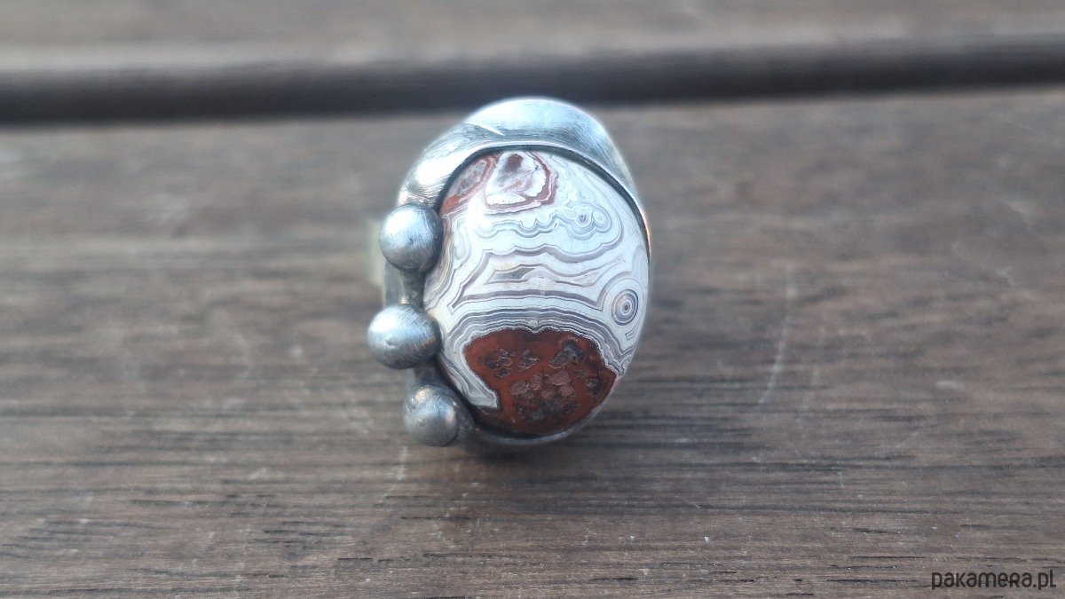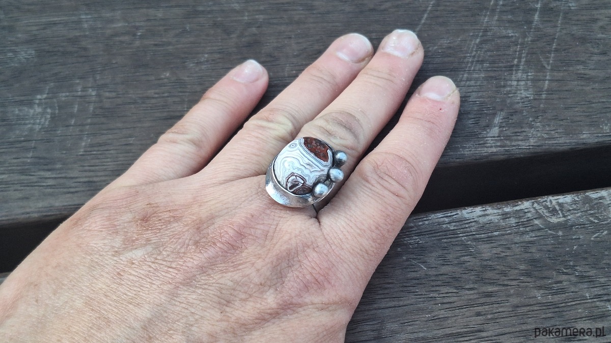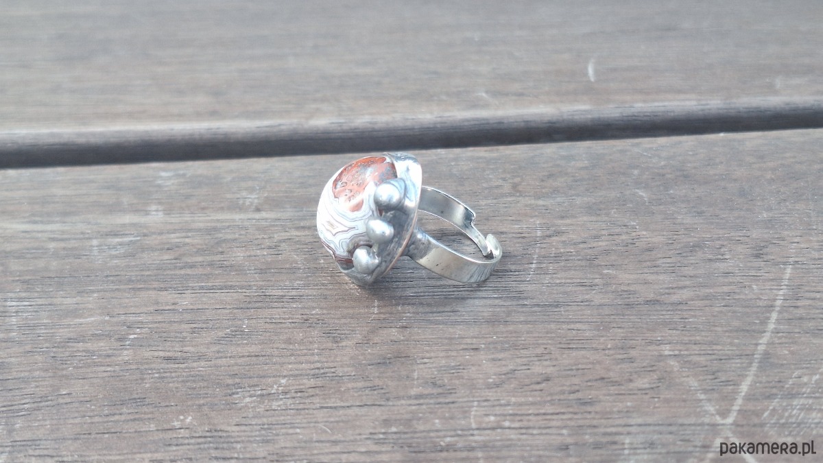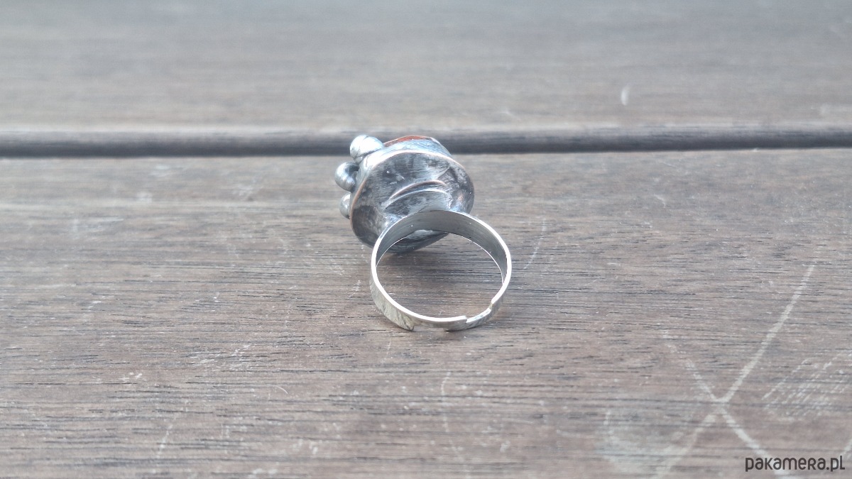 Pierścionek wykonany z miedzi, cyny i agatu meksykańskiego. Wymiary ok. 2.2 na 1.6 cm. Regulowany. Nie jest ciężki.