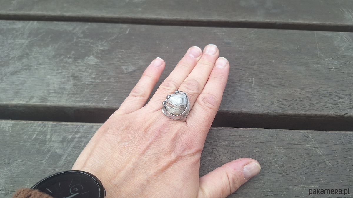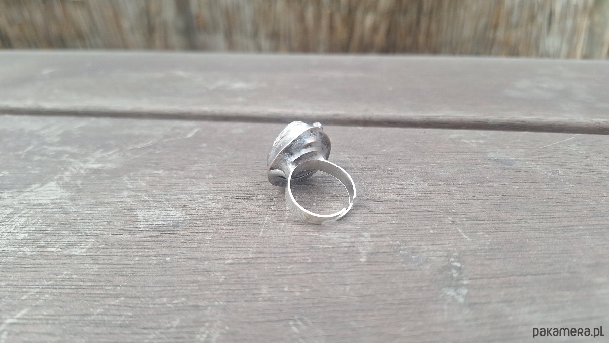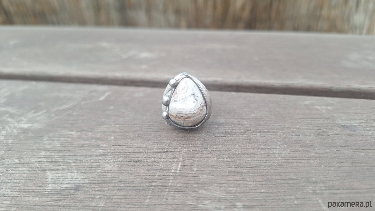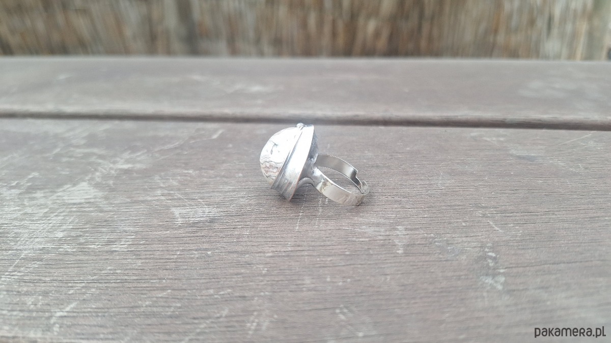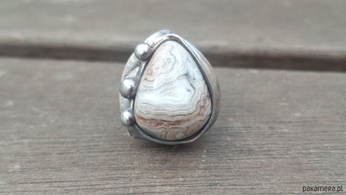 Pierścionek wykonany z miedzi, cyny i agatu meksykańskiego. Wymiary ok. 2 na 1.8 cm. Regulowany. Nie jest ciężki.