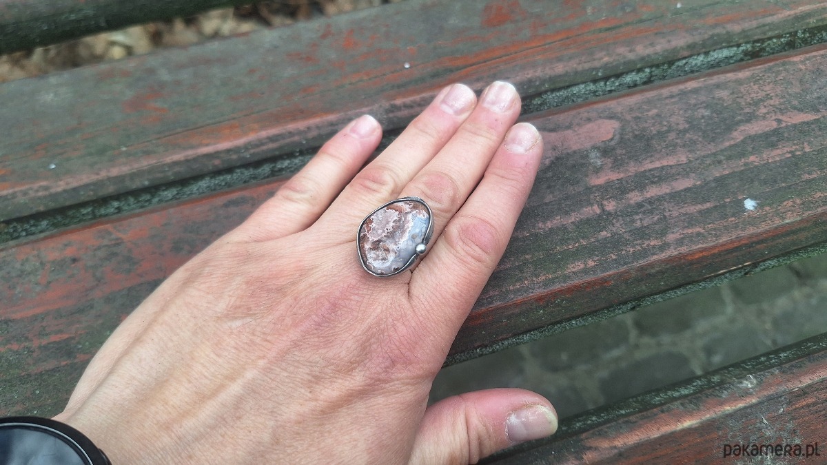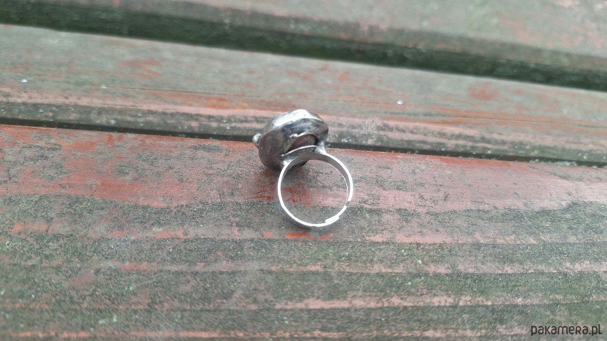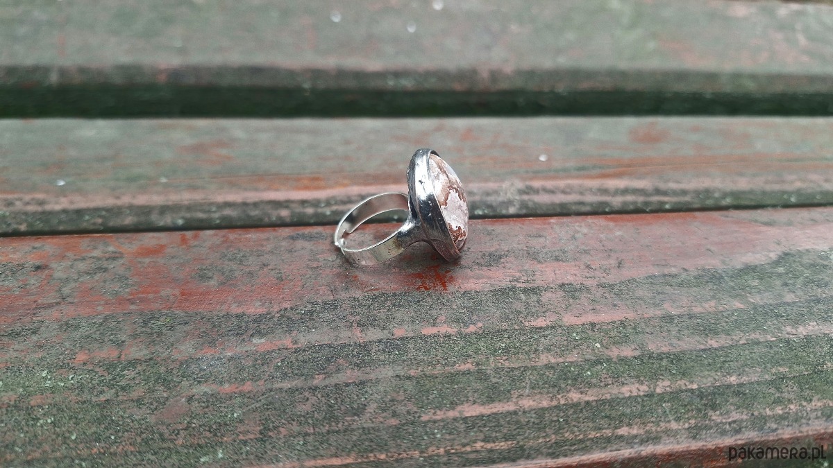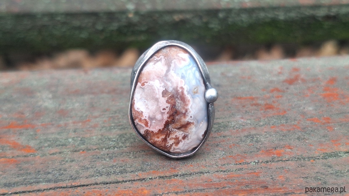 Pierścionek wykonany z miedzi, cyny i agatu meksykańskiego. Wymiary ok. 2.4 na 2 cm. Regulowany. Nie jest ciężki.