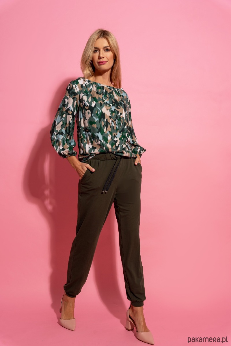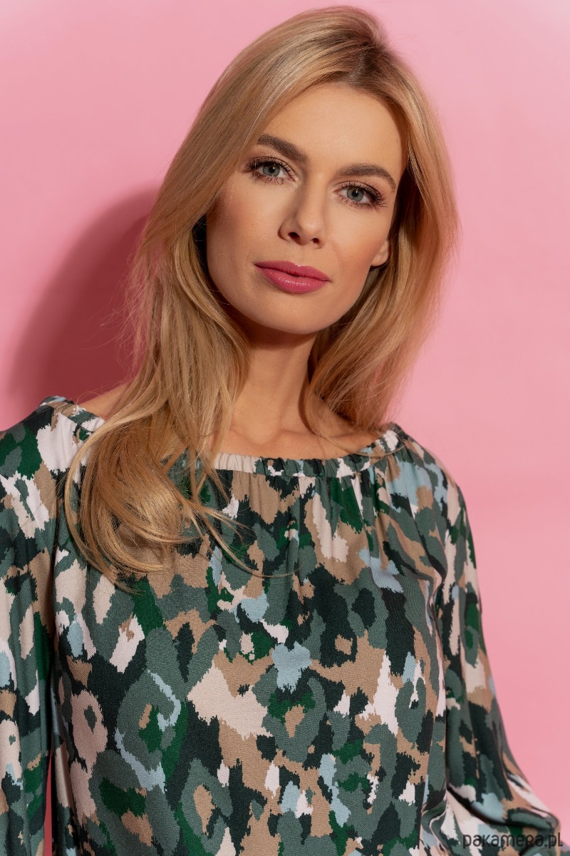 Tkaninowa bluzka o prostym, eleganckim kroju. Długość do bioder. Wykonana z przyjemnej w dotyku wiskozy w print moro. Szeroki dekolt w łódkę oraz mankiety marszczone na gumce. Delikatnie balonowe rękawy dodają kobiecego sznytu. Bluzka świetnie wygląda w połączeniu jeansami, swobodnym dzianinowym dołem oraz w bardziej eleganckim wydaniu. Świetnie pasuje z szerokimi, beżowymi spodniami LETTA, z tkaniny imitującej skórę.