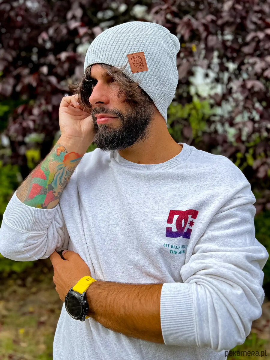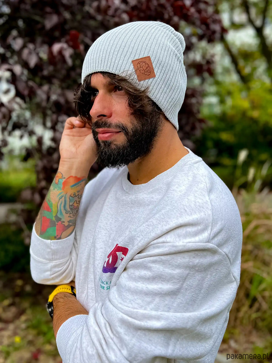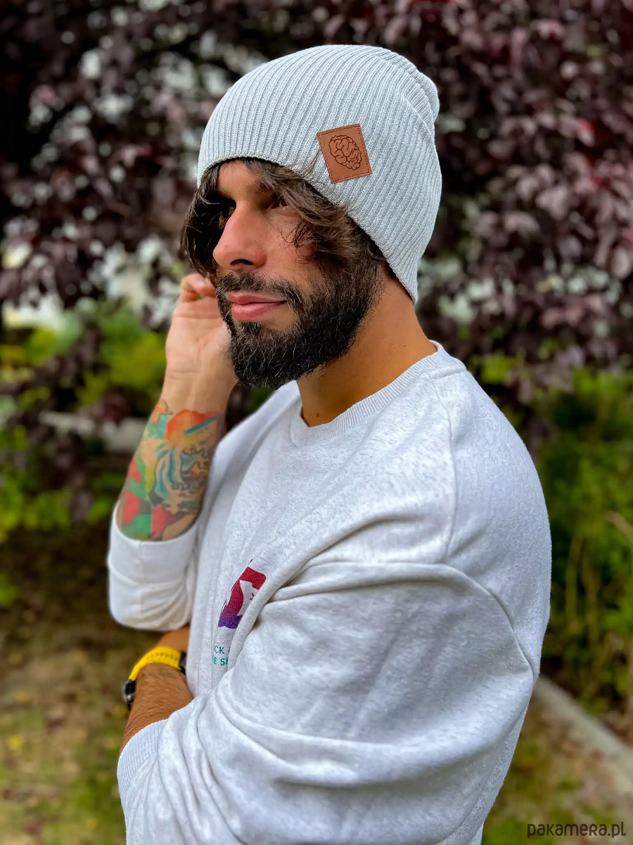 Męska bawełniana czapka jesienna logo ekoskórka Jasny szary