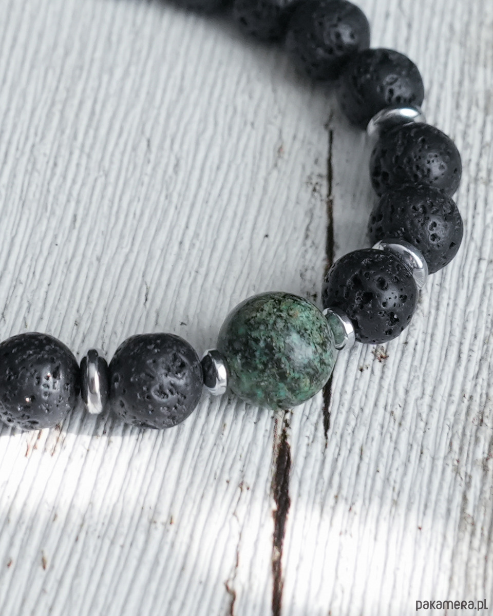 Męska, dość masywna bransoleta z surowej LAWY WULKANICZNEJ i srebrnego HEMATYTU. Centralnym elementem bransolety jest zielony TURKUS AFRYKAŃSKI.