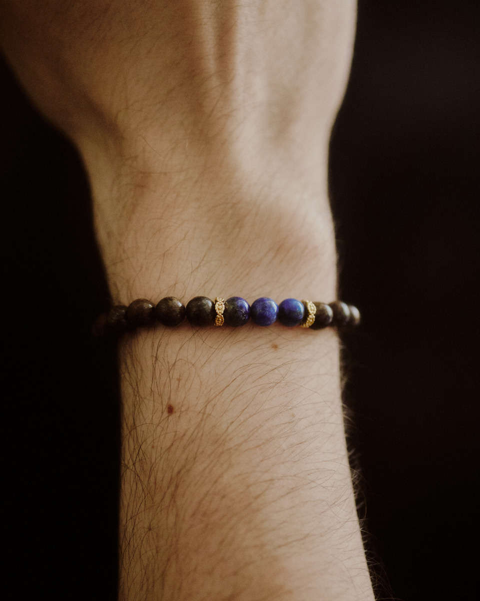 Bransoletka męska z lapis lazuli, bronzytu i pozłacanych przekładek 𓂀 Zapleciona na gumce jubilerskiej.