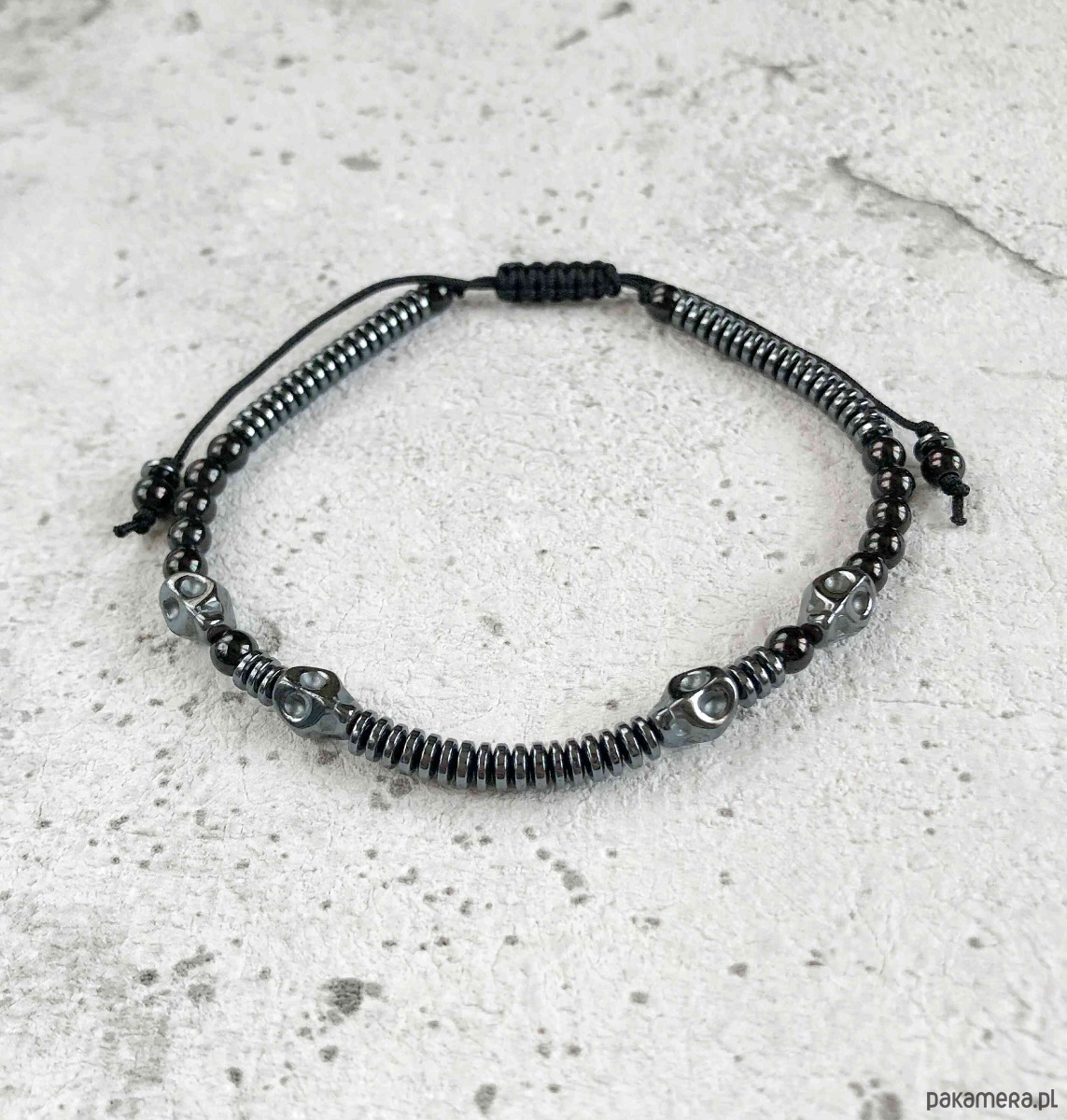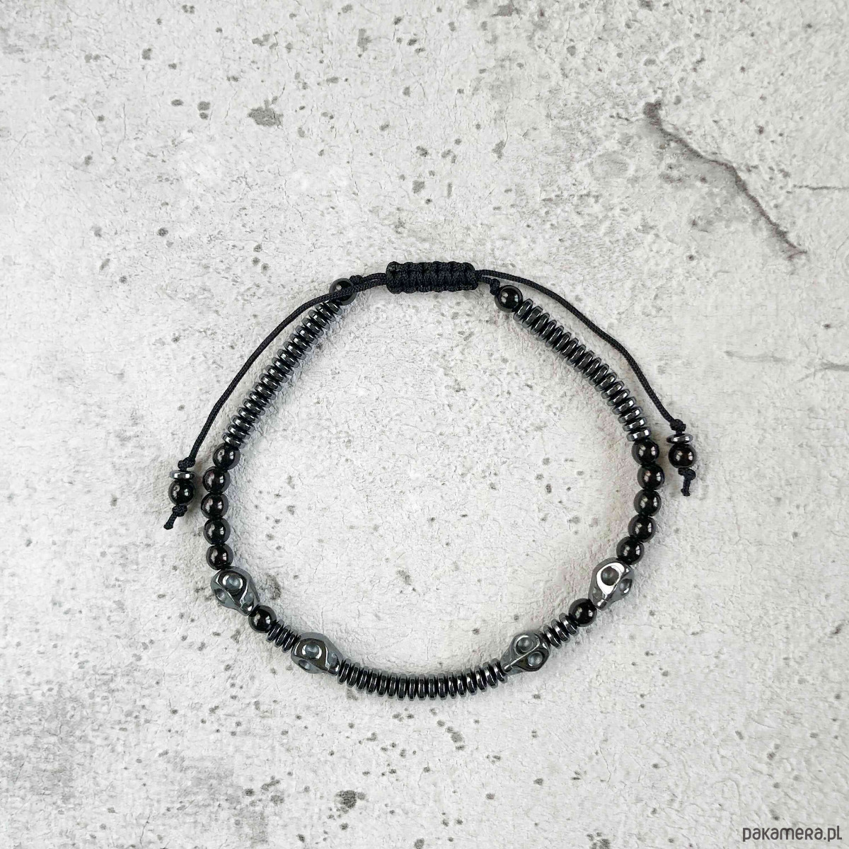 Bransoletka na regulowanym sznurku dla mężczyzny z charakterem, wykonana z kamieni grafitowych i czarnych hematytów o zróżnicowanym kształcie : oponki 4x1,5, kulki 4mm, oraz 4 czaszki 6x8mm.