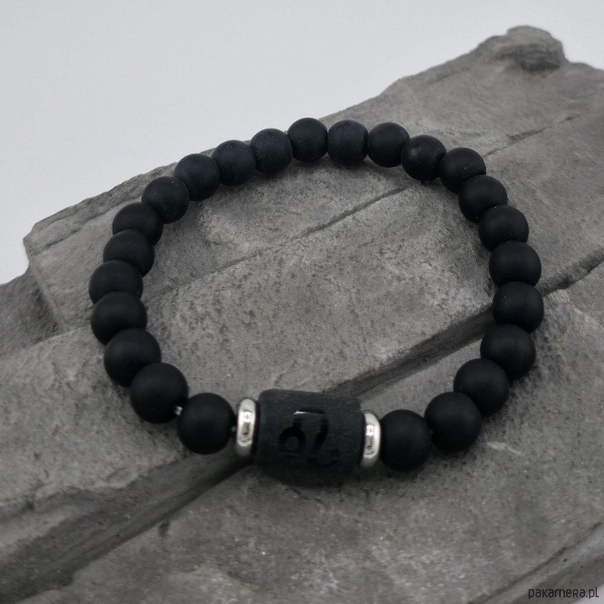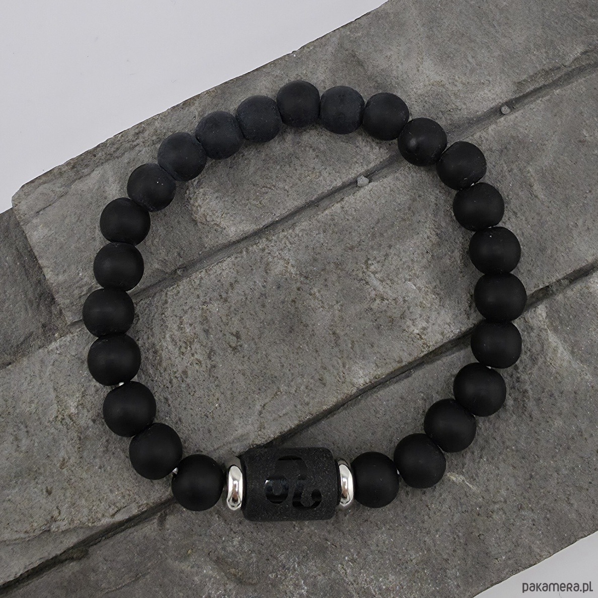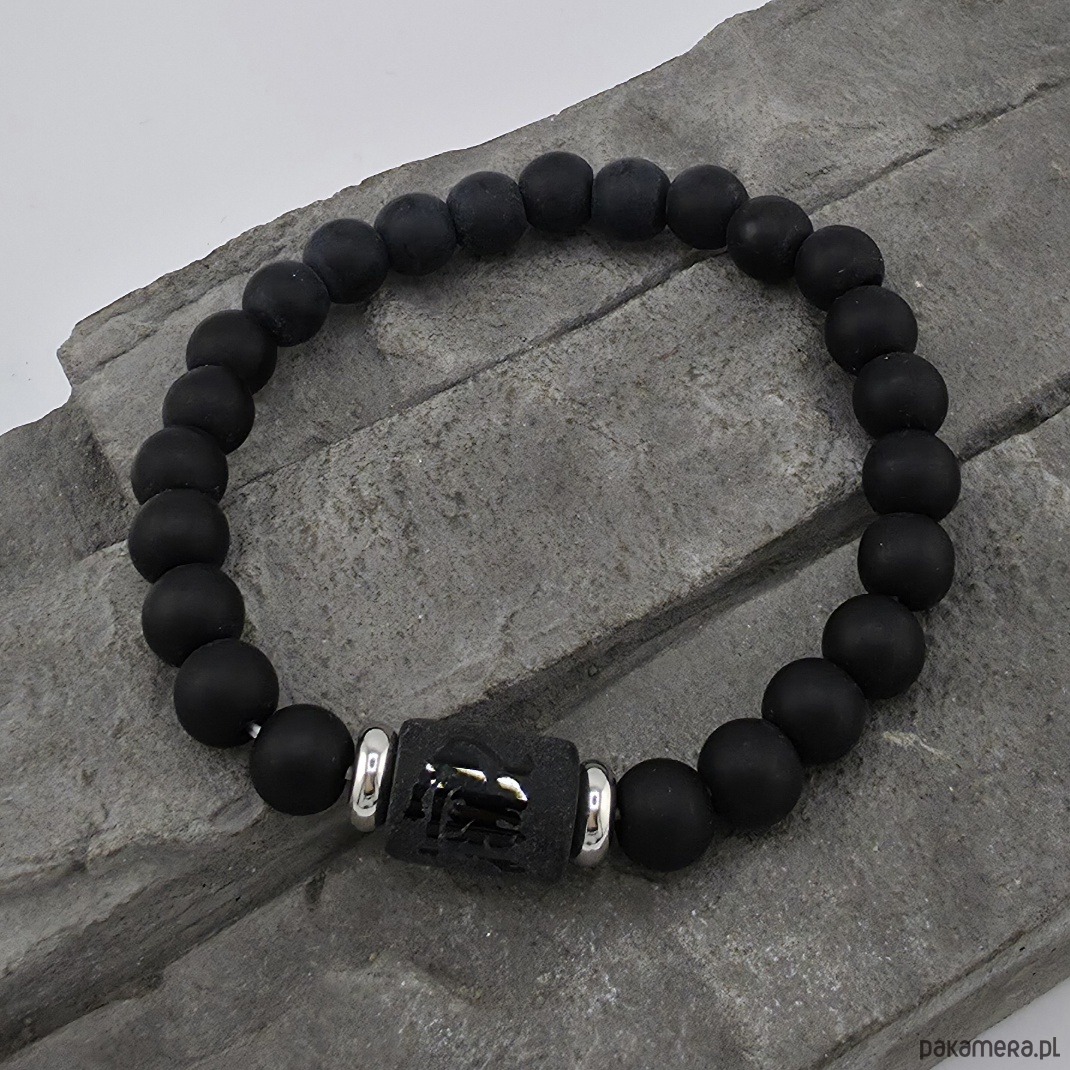 Oryginalna bransoletka dla meżczyzny. Wykonana z korala ze znakiem zodialu, stali chirurgucznej oraz kul lawy wulkanicznej wielkości 8 mm. Wewnetrzny obwód bransoletki to ok. 17 cm. Całość wykonana na mocnej gumce. Moge wykonać podobną bransoketke dla innego znaku zodiaku - proszę napisz wiadomość i zapytaj. Ozdobnie zapakowana.