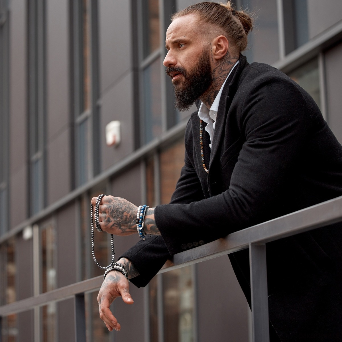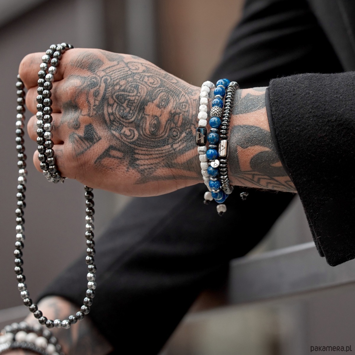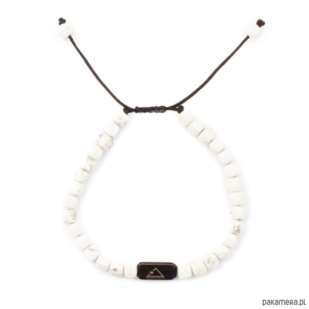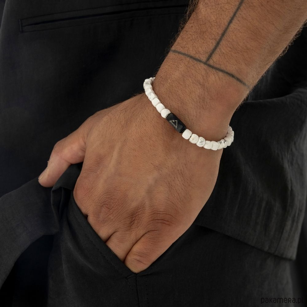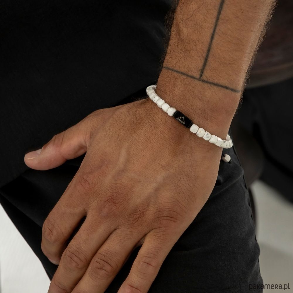 Minimalistyczna bransoletka wykonana z naturalnego Howlitu o subtelnym, białym odcieniu z delikatnym, szarym użyleniem. Uzupełniona centralnym elementem z logo, na czarnym kamieniu, który nadaje całości kontrastu i wyrazistości. Regulowane zapięcie na czarnym sznurku zapewnia wygodę noszenia i możliwość dopasowania do każdego nadgarstka.Znaczenie kamienia:Howlit to kamień mądrości. Doskonale wycisza, koi i uczy cierpliwości. Uspokaja nasz umysł i pomaga podejmować roztropne decyzje.
