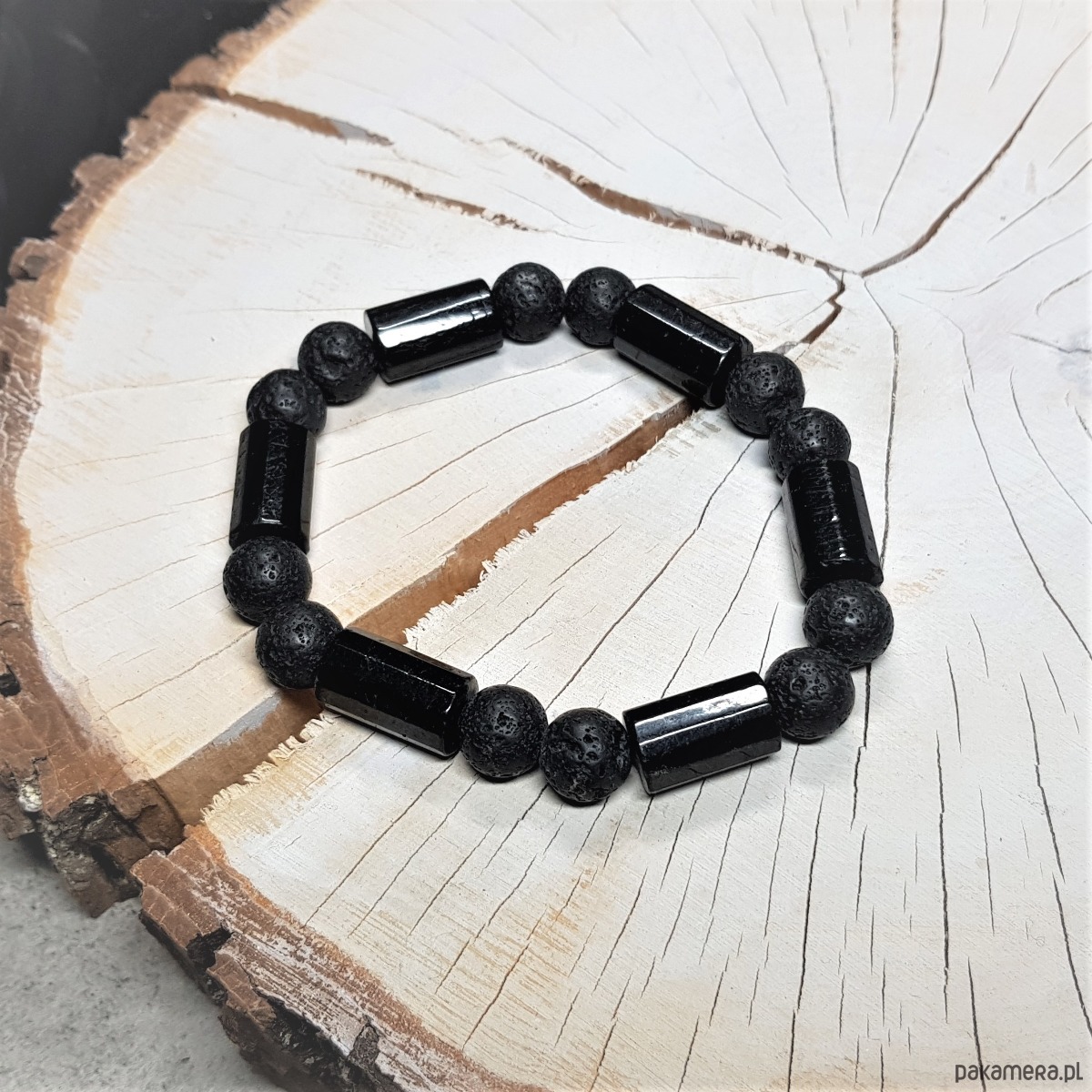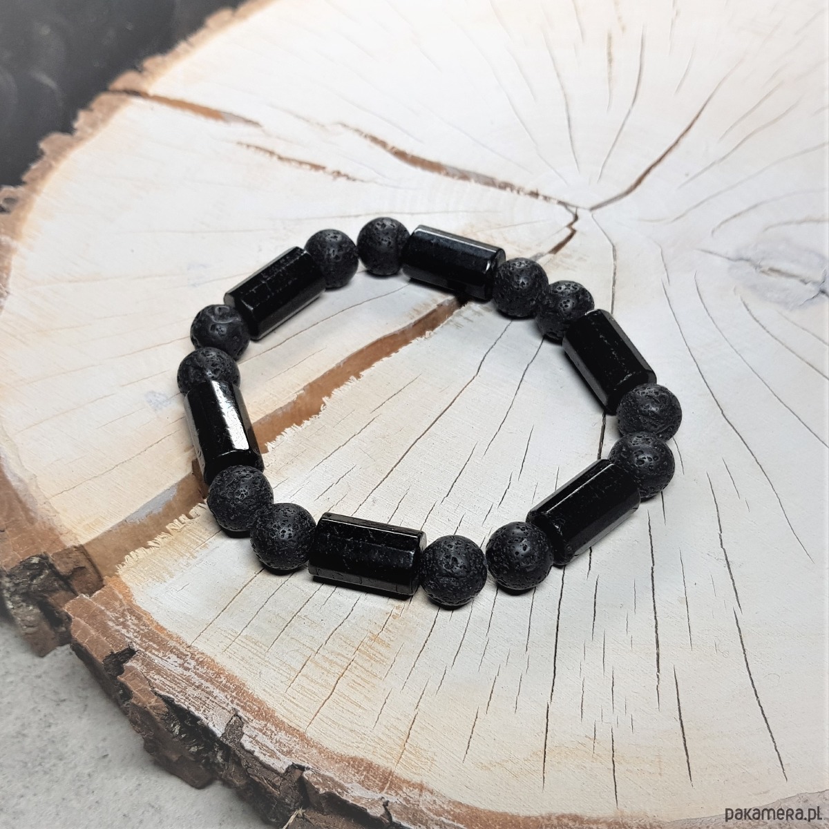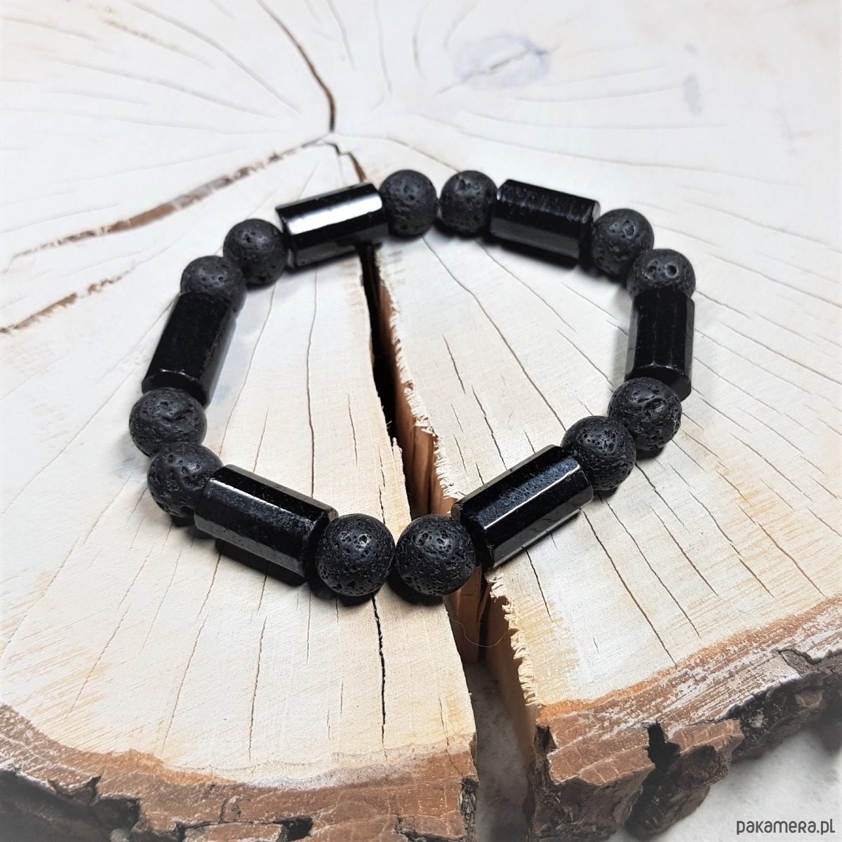 Bransoletka mocy dla mężczyzny wykonana z naturalnych kamieni – dużych wałków turmalinu (średnica 10mm, długość 17mm) oraz lawy wulkanicznej o średnicy 10mm. Kamienie nawleczone są na podwójną mocną gumkę, co jest bardzo komfortowe przy zakładaniu.