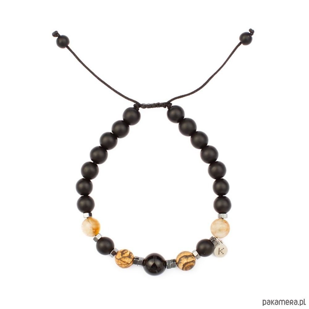 Ta bransoletka to połączenie minimalizmu i naturalnego piękna kamieni. Czerń Onyksu i Czarnego Turmalinu tworzy mocną, wyrazistą bazę, którą przełamują ciepłe odcienie Jaspisu i złociste refleksy Cytrynu. Dodatkowe akcenty Hematytu nadają całości elegancji i nowoczesnego charakteru. Zestawienie pięciu kamieni sprawia, że każda bransoletka jest unikalna – subtelne różnice w strukturze i barwie kamieni podkreślają jej naturalne pochodzenie. Regulowany czarny sznurek zapewnia wygodę noszenia i możliwość dopasowania do nadgarstka, dzięki czemu biżuteria świetnie sprawdzi się zarówno w codziennych stylizacjach, jak i w bardziej eleganckim wydaniu. To bransoletka dla osób, które lubią wyróżniać się detalami – łączy w sobie prostotę, odrobinę surowości i szczyptę luksusu. Znaczenie kamieni: Cytryn to kamień bogactwa. Sprzyja utrzymaniu stabilności w sferze materialnej oraz satysfakcji z życia zawodowego. Przyciąga wiele dobrych okazji i pomocnych ludzi. Jaspis to kamień zdrowia. Poprawia atmosferę w pracy i w rodzinie. W związkach wpływa na spokój, zaufanie i harmonię. Turmalin czarny to kamień ochrony. Jest wyjątkowym kamieniem, który zapewnia ochronę przed tzw. złym okiem, czyli zazdrością, szkodliwymi intencjami oraz innymi rodzajami negatywnych wpływów, takimi jak obawy, strach i złość. Onyks to kamień sukcesu. Jego energia wzmacnia wytrzymałość i odporność przy wykonywaniu trudnych, złożonych zadań. Hematyt to kamień wojowników. Silnie oczyszcza krew. Budzi radość do życia, dodaje odwagi i wiary.Każda bransoletka różni się nieco od siebie, ponieważ nie ma dwóch takich samych kamieni. Dla klienta wybieramy kamienie z wielką starannością, zawsze intuicyjnie. Wymiary: Kamienie: Onyks/Turmalin Czarny/Jaspis/Cytryn/Hematyt Wielkość kamieni: 8mm/10mm/8mm/8mm/2mm Grubość nici: ok. 0,45 mm Blaszka z logo: 6mm