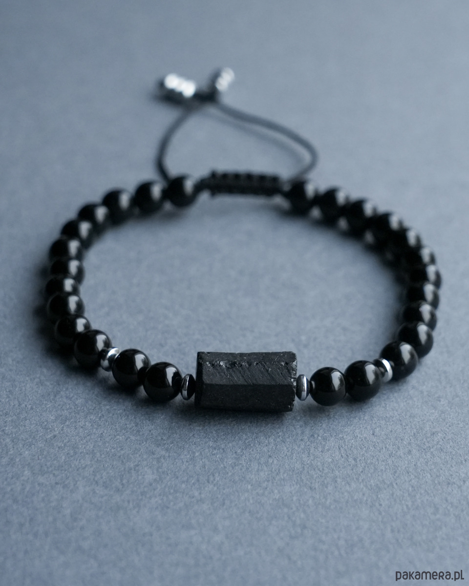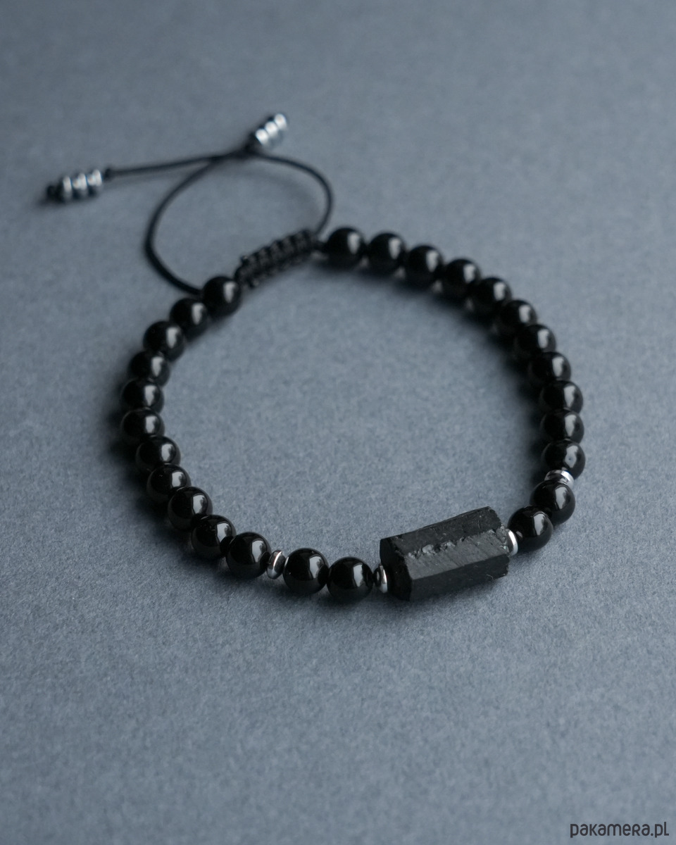 Męska, minimalistyczna bransoletka ochronna z czarnego ONYKSU i srebrnego HEMATYTU, której centralny element stanowi czarny, surowy TURMALIN w formie ciosanej bryłki. Bransoletka posiada przesuwane "zapięcie" wykonane w technice makramy, dzięki czemu jest regulowana i ma uniwersalny rozmiar.