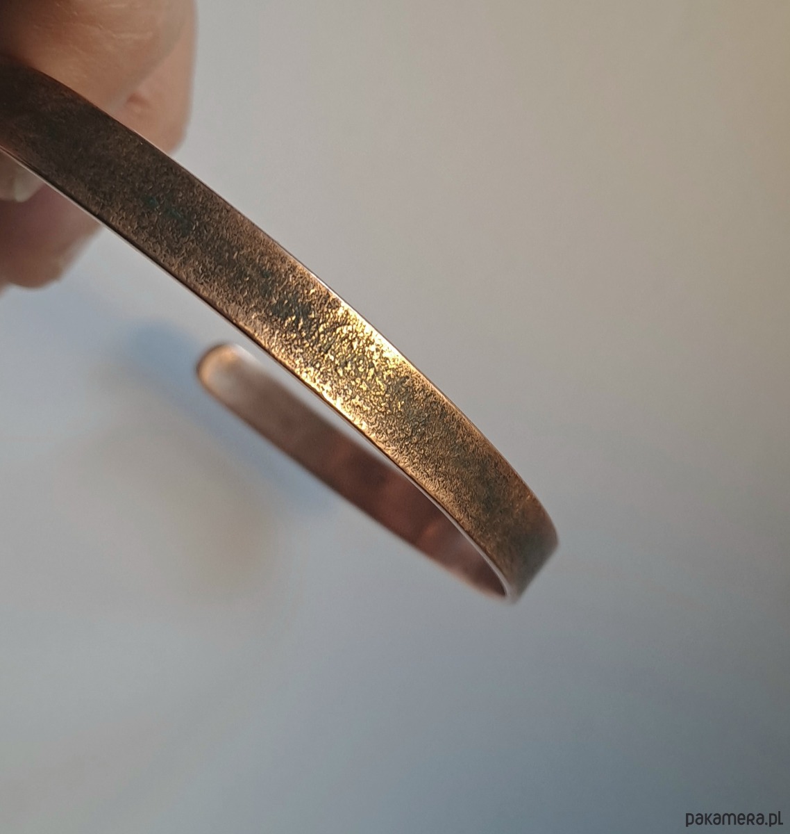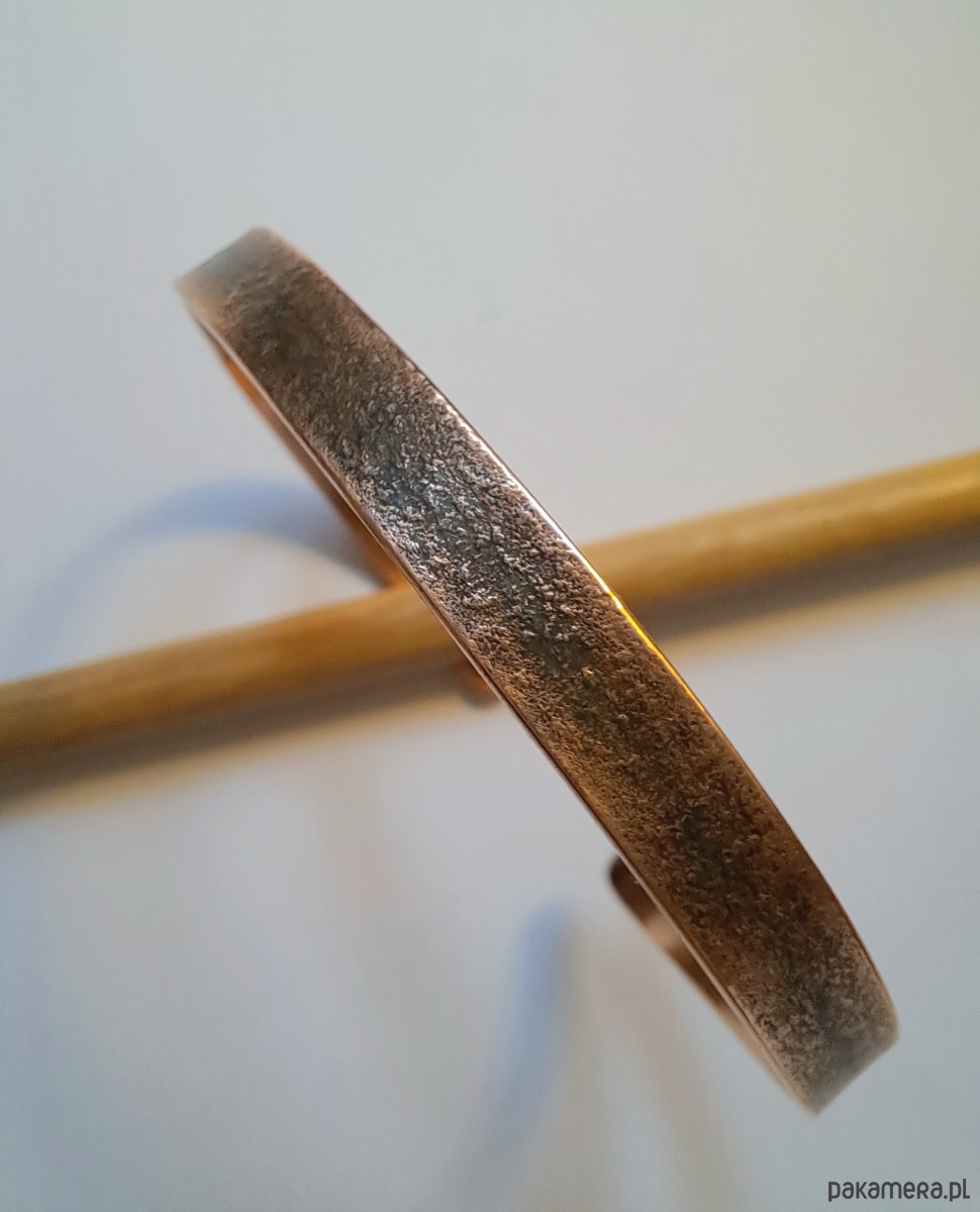 Bransoletka posiada na zewnątrz delikatną, nieregularną fakturę, którą podkreśla czarna patyna (powstaje w naturalnym, wielodniowym procesie patynowania). Patyna jest trwała i nie "schodzi" podczas noszenia.