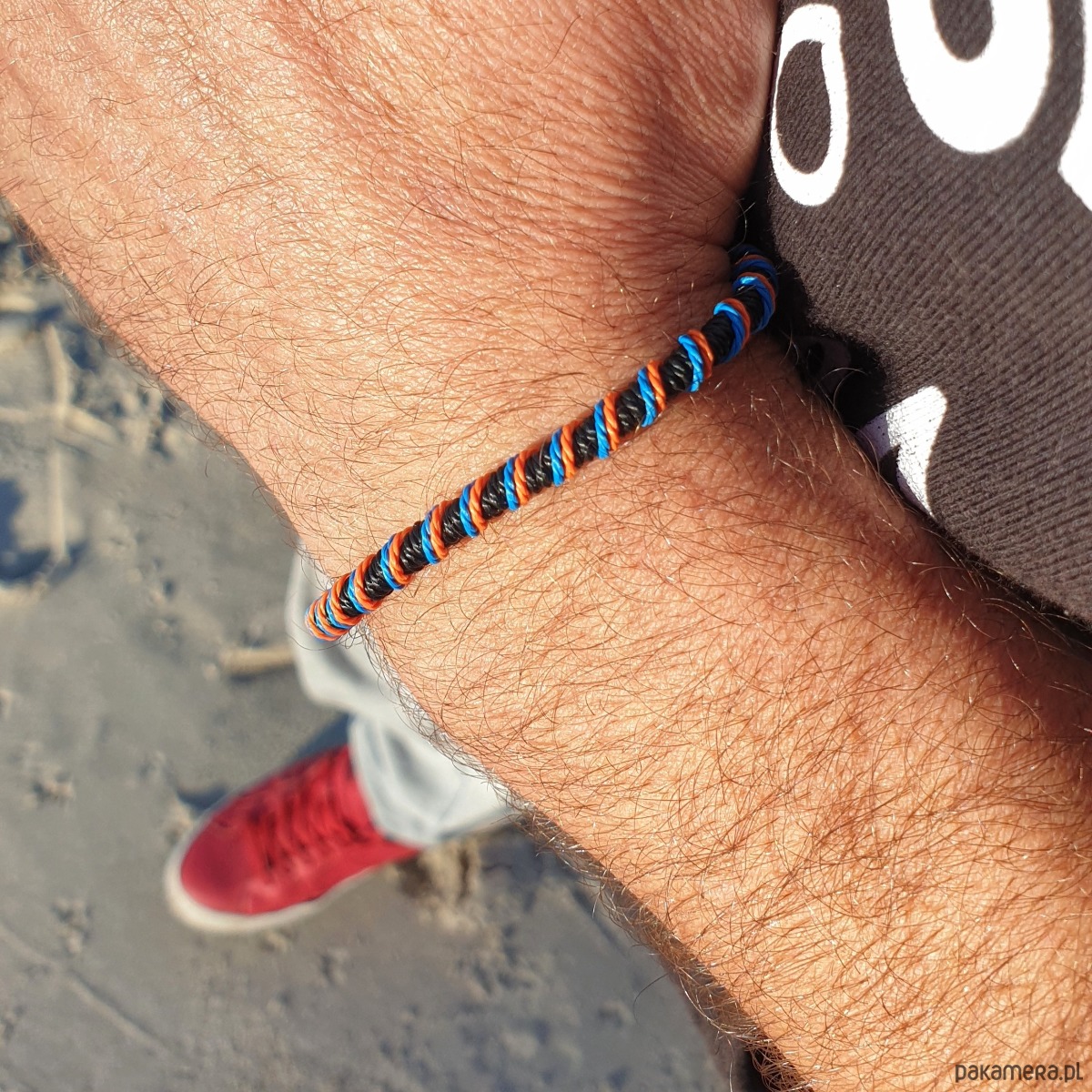 Męska Bransoletka sznurkowa - snake spiralna - czarno pomarańczowo niebieska .