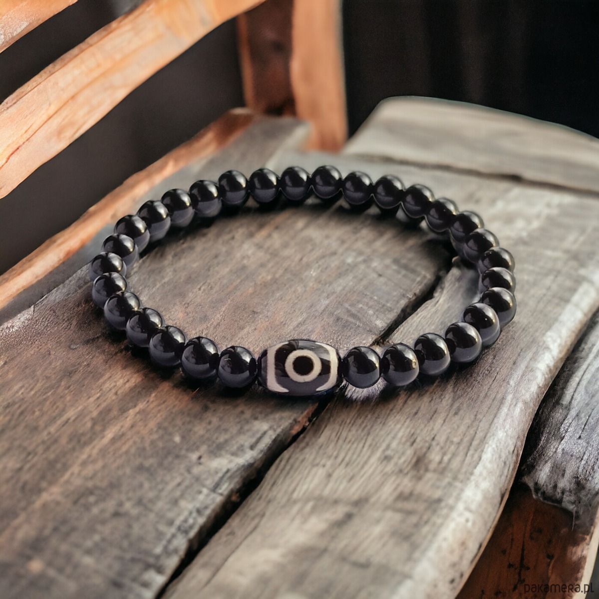 delikatna niezwykle ciekawa bransoletka- talizman wykonana z onyksu (kuleczki 6mm) oraz elementu z AGATU TYBETAŃSKIEGO (czerń + beż)