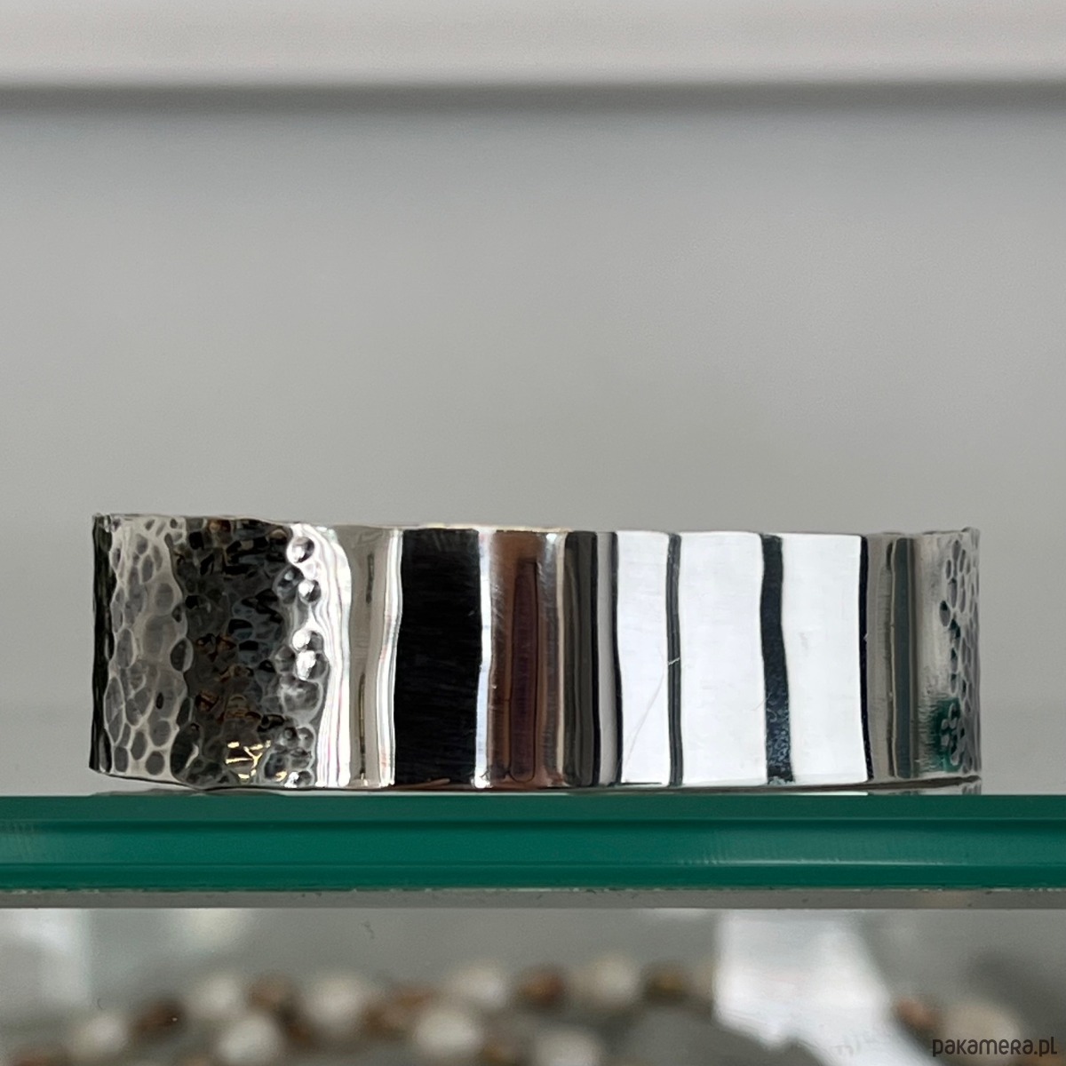 Wykończenie bransoletki : środkowa część bransoletki jest idealnie wypolerowana na wysoki połysk, co nadaje jej luksusowego charakteru. Końcówki bransoletki ozdobiona są unikatową, ręcznie kutą fakturą, przypominającą delikatne wgniecenia. To połączenie gładkiej i fakturowanej powierzchni tworzy intrygujący kontrast i sprawia, że bransoletka wyróżnia się spośród innych.