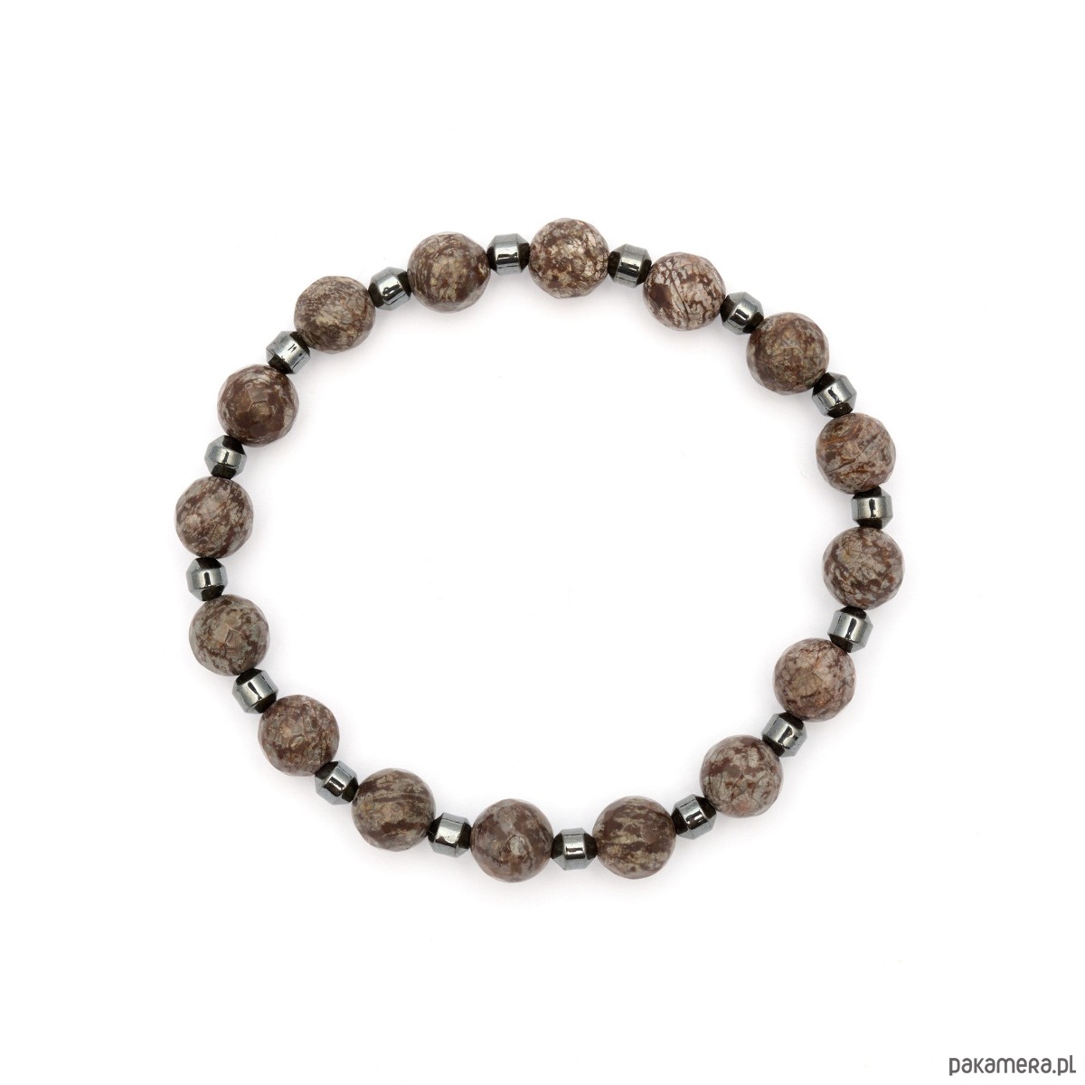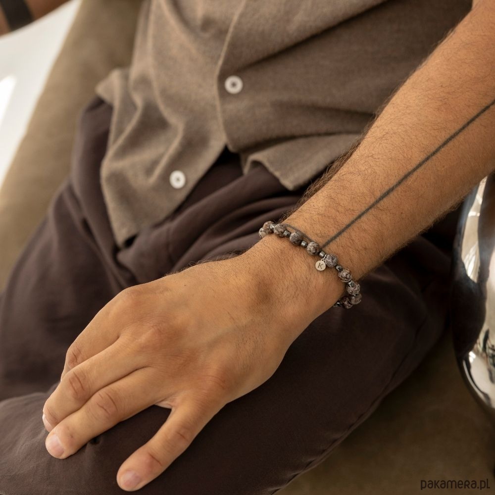 Ta męska bransoletka to połączenie natury i siły. Wykonana z naturalnych kamieni Jaspisu w ciepłych, brązowych odcieniach, przyciąga uwagę swoim niepowtarzalnym wzorem – każdy kamień to inna historia zapisana przez naturę. Kontrastujące, grafitowe elementy Hematytu dodają jej elegancji i podkreślają męski charakter biżuterii. Bransoletka została nawleczona na elastycznej lince, dzięki czemu świetnie dopasowuje się do nadgarstka i jest wygodna w codziennym noszeniu. To uniwersalny dodatek – sprawdzi się zarówno w casualowych stylizacjach, jak i w eleganckich zestawach, dodając im charakteru i wyrazistości. Znaczenie kamienia: Jaspis to kamień zdrowia. Poprawia atmosferę w pracy i w rodzinie. Pozytywnie wpływa na zdrowie fizyczne i emocjonalne. Hematyt to kamień wojowników. Silnie oczyszcza krew. Budzi radość do życia, dodaje odwagi i wiary we własne umiejętności. Przy wyborze rozmiaru bransoletki kieruj się obwodem nadgarstka mierzonym tak, aby miarka ciasno przylegała do jego najszczuplejszego miejsca. Każda bransoletka różni się nieco od siebie, ponieważ nie ma dwóch takich samych kamieni. Dla klienta wybieramy kamienie z wielką starannością, zawsze intuicyjnie. Wymiary: Kamienie: Jaspis/Hematyt Wielkość kamieni: 10mm/ok.4mm Blaszka z logo: 6mm