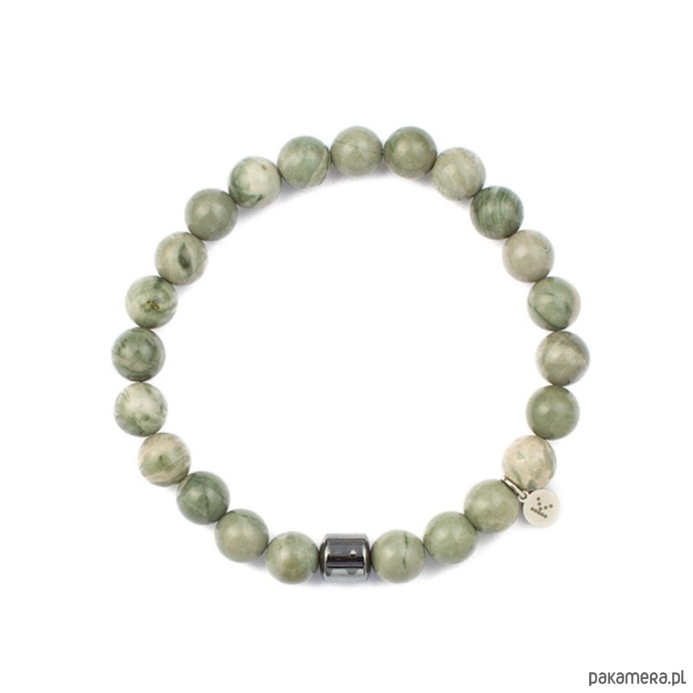 Męska bransoletka wykonana z naturalnego Jaspisu w odcieniach szarości i zieleni, które nadają jej eleganckiego, stonowanego charakteru. Całość przełamuje ozdobny, srebrzysty element, który dodaje nowoczesnego akcentu i podkreśla wyjątkowy styl biżuterii.Bransoletka wykonana jest na elastycznej gumce, dzięki czemu wygodnie dopasowuje się do nadgarstka i zapewnia komfort codziennego noszenia. To uniwersalny dodatek, który świetnie sprawdzi się zarówno w casualowych zestawach, jak i w bardziej eleganckich stylizacjach.Znaczenie kamieni: Jaspis to kamień zdrowia. Poprawia atmosferę w pracy i w rodzinie. Pozytywnie wpływa na zdrowie fizyczne i emocjonalne.Przy wyborze rozmiaru bransoletki kieruj się obwodem nadgarstka mierzonym tak, aby miarka ciasno przylegała do jego najszczuplejszego miejsca.Każda bransoletka różni się nieco od siebie, ponieważ nie ma dwóch takich samych kamieni. Dla klienta wybieramy kamienie z wielką starannością, zawsze intuicyjnie.Wymiary:Kamienie: JaspisWielkość kamieni: 10mmBlaszka z logo: 6mm