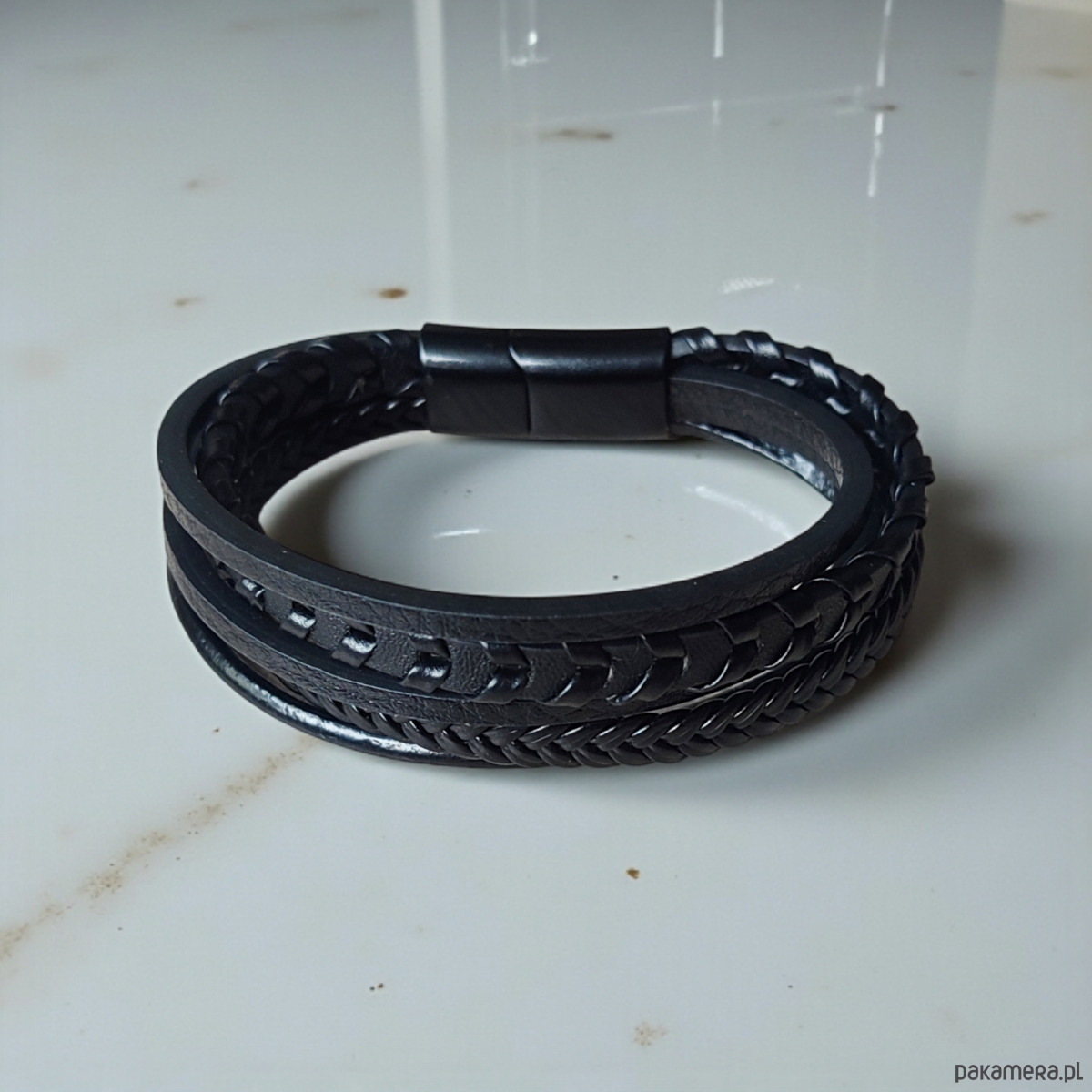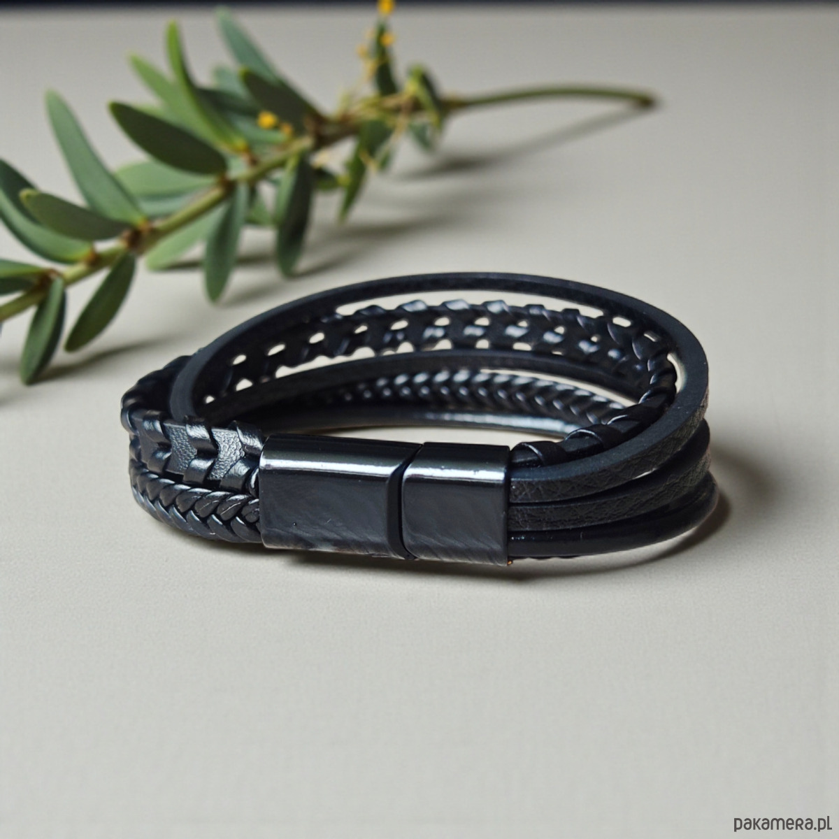 Elegancka bransoletka wykonana z wysokiej jakości czarnej ekoskóry wyposażona w solidne magnetyczne zapięcie zapewniające wygodę użytkowania. Idealna jako nowoczesny dodatek do codziennego stroju.