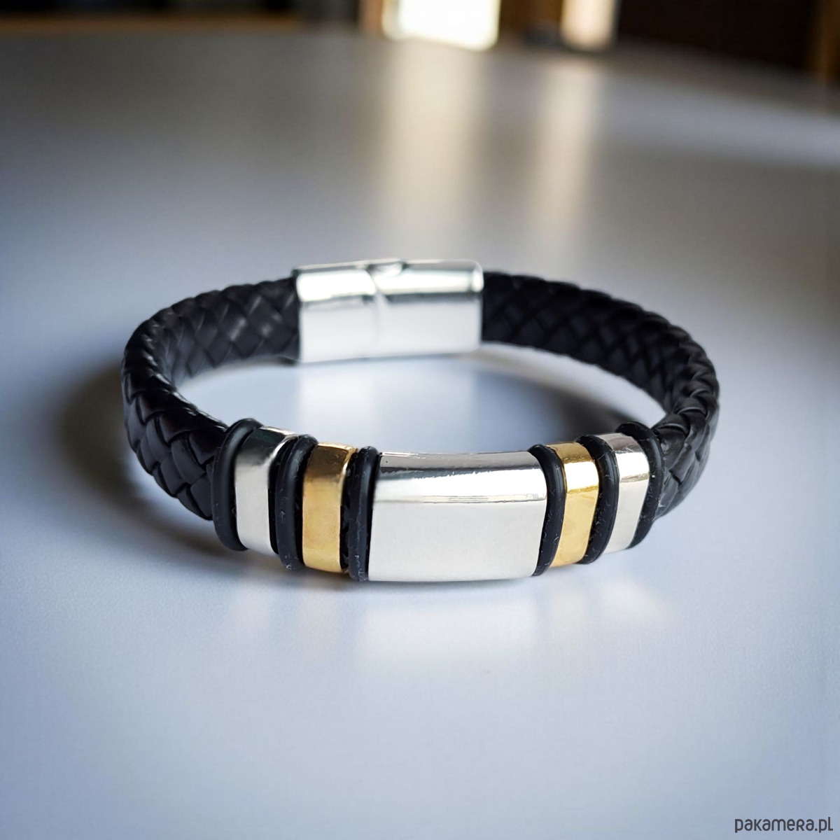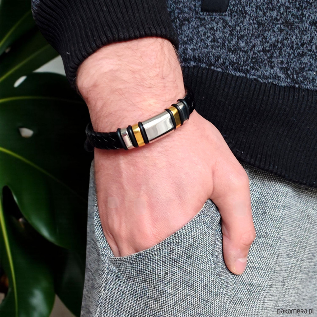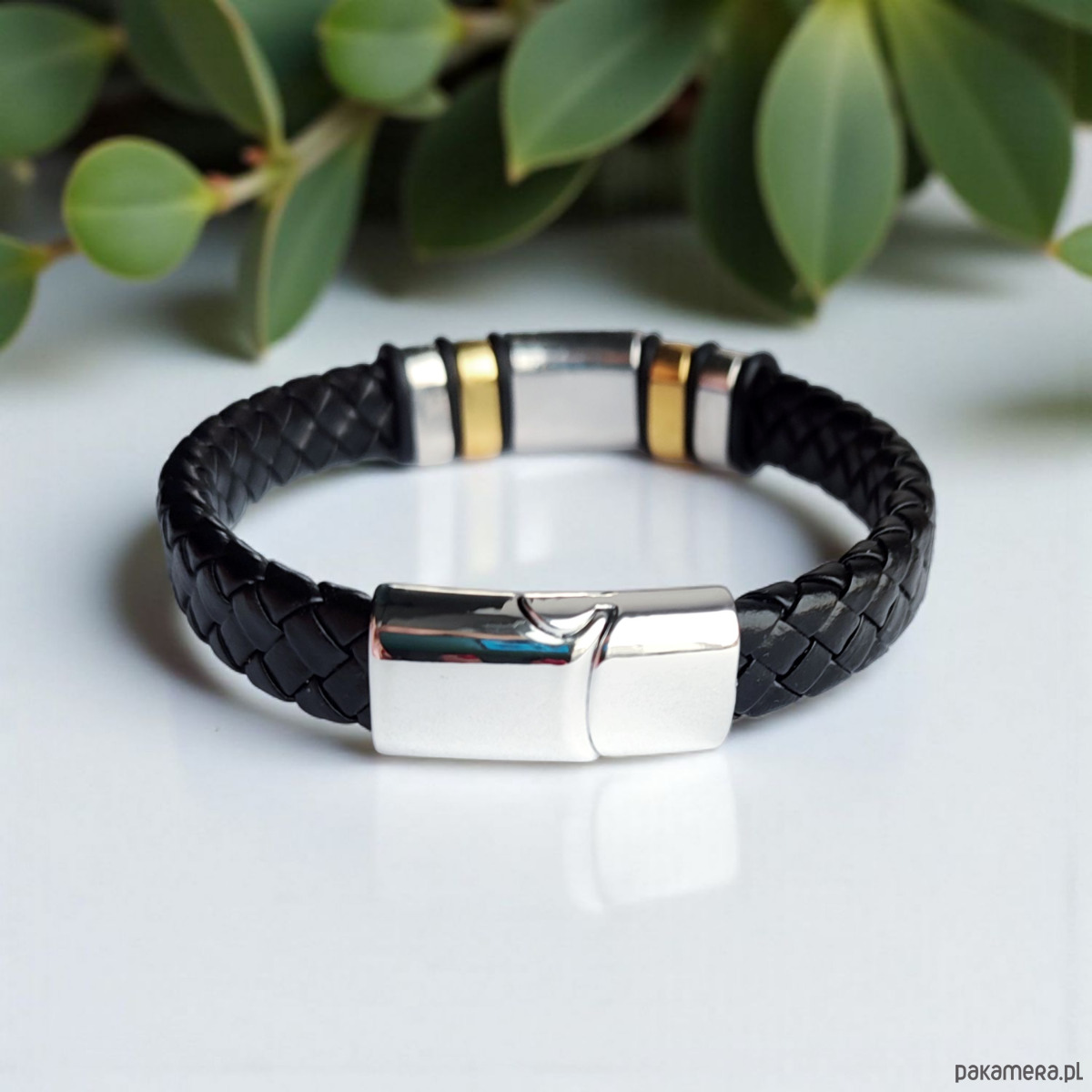 Męska bransoletka wykonana z czarnej ekoskóry, uzupełniona elementami ze stali nierdzewnej. Zapięcie magnetyczne gwarantuje łatwe i pewne użytkowanie. Klasyczny design sprawia, że bransoletka doskonale komponuje się z codziennym i eleganckim stylem.