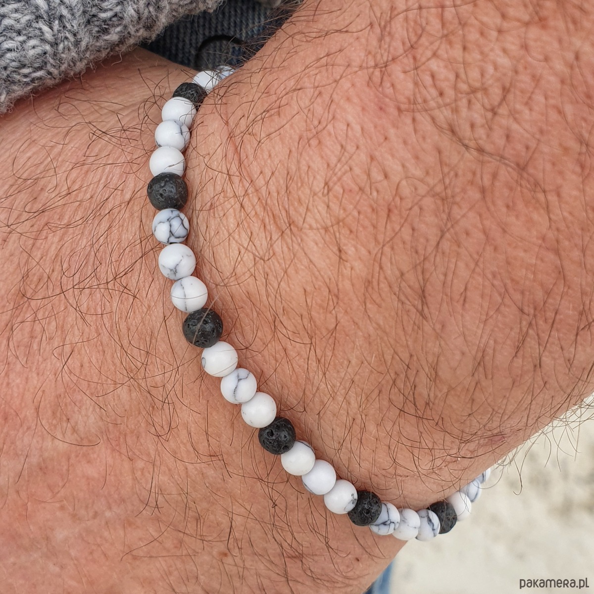 Męska bransoletka z kamieniami Lawa wulkaniczna i howlit biały- 4mm