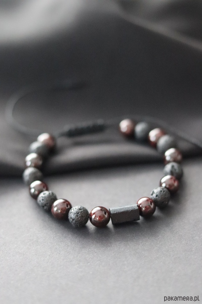 Granat, główny kamień tej bransoletki, jest znany jako kamień pasji i oddania, który wzmacnia więzi międzyludzkie, buduje zaufanie i pomaga otworzyć serce na głębokie uczucia. Towarzyszy mu turmalin, minerał o właściwościach ochronnych, który wspiera emocjonalną harmonię, chroni serce przed negatywnymi wpływami i pomaga w otwarciu się na szczere relacje. Lawa wulkaniczna, będąca symbolem siły i stabilności, równoważy energię, wspiera pewność siebie i pomaga wyciszyć codzienny stres.
