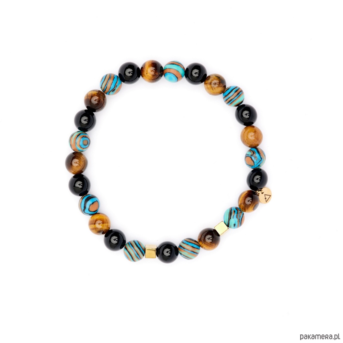 Każda bransoletka różni się nieco od siebie, ponieważ nie ma dwóch takich samych kamieni. Dla klienta wybieramy kamienie z wielką starannością, zawsze intuicyjnie.Wymiary:Kamienie: Onyks/Tygrysie oko/Malachit/HematytWielkość kamieni: 8mm/8mm/8mm/4mmBlaszka z logo: 6mm