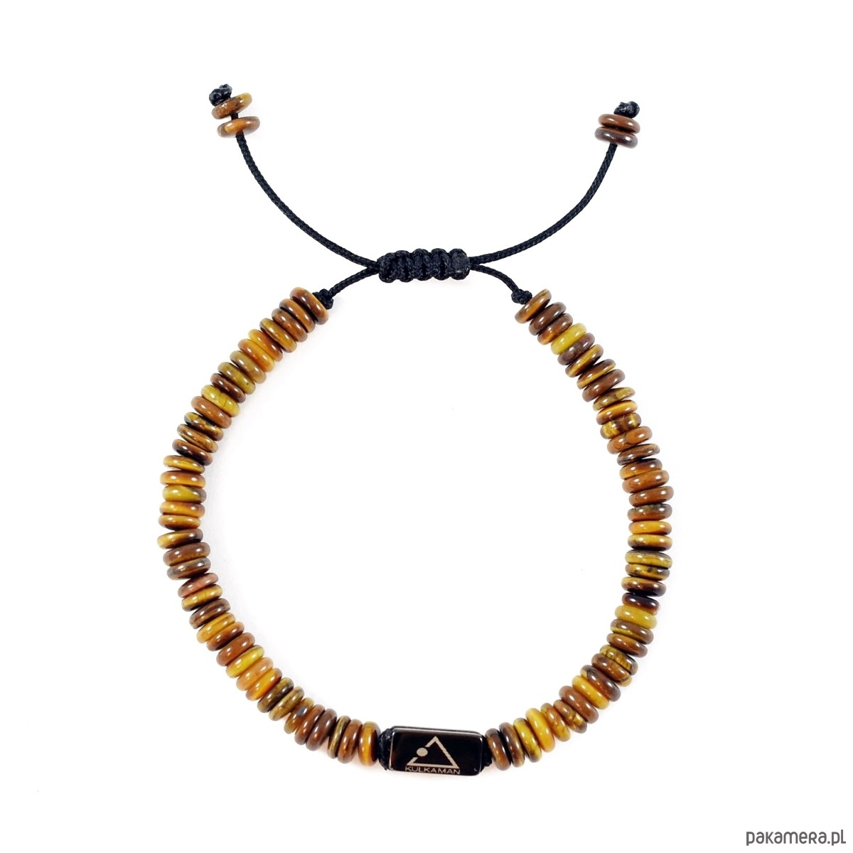 Męska bransoletka wykonana z naturalnego Tygrysiego Oka w formie gładkich krążków, których ciepłe, brązowo-złote odcienie tworzą niepowtarzalną, elegancką kompozycję. Kamienie osadzone zostały na czarnym sznurku, regulowanym metodą plecionej makramy, co pozwala idealnie dopasować bransoletkę do nadgarstka.Centralnym akcentem jest stalowy element z grawerowanym logo marki, podkreślający nowoczesny i męski charakter biżuterii.Znaczenie kamieni: Tygrysie oko to kamień odwagi. Dodaje odwagi w wyrażaniu własnego zdania, wzmacnia wolę przetrwania i dążenia do sukcesu.Jest to idealna bransoletka do noszenia na co dzień, pasować będzie do większości męskich outfitów.Przy wyborze rozmiaru bransoletki kieruj się obwodem nadgarstka mierzonym tak, aby miarka ciasno przylegała do jego najszczuplejszego miejsca.Każda bransoletka różni się nieco od siebie, ponieważ nie ma dwóch takich samych kamieni. Dla klienta wybieramy kamienie z wielką starannością, zawsze intuicyjnie.Wymiary:Kamienie: Tygrysie okoWielkość kamieni: ok. 6,5mm x 2mmWielkość logo: 13mm x 4mmKolor sznurka: czarny