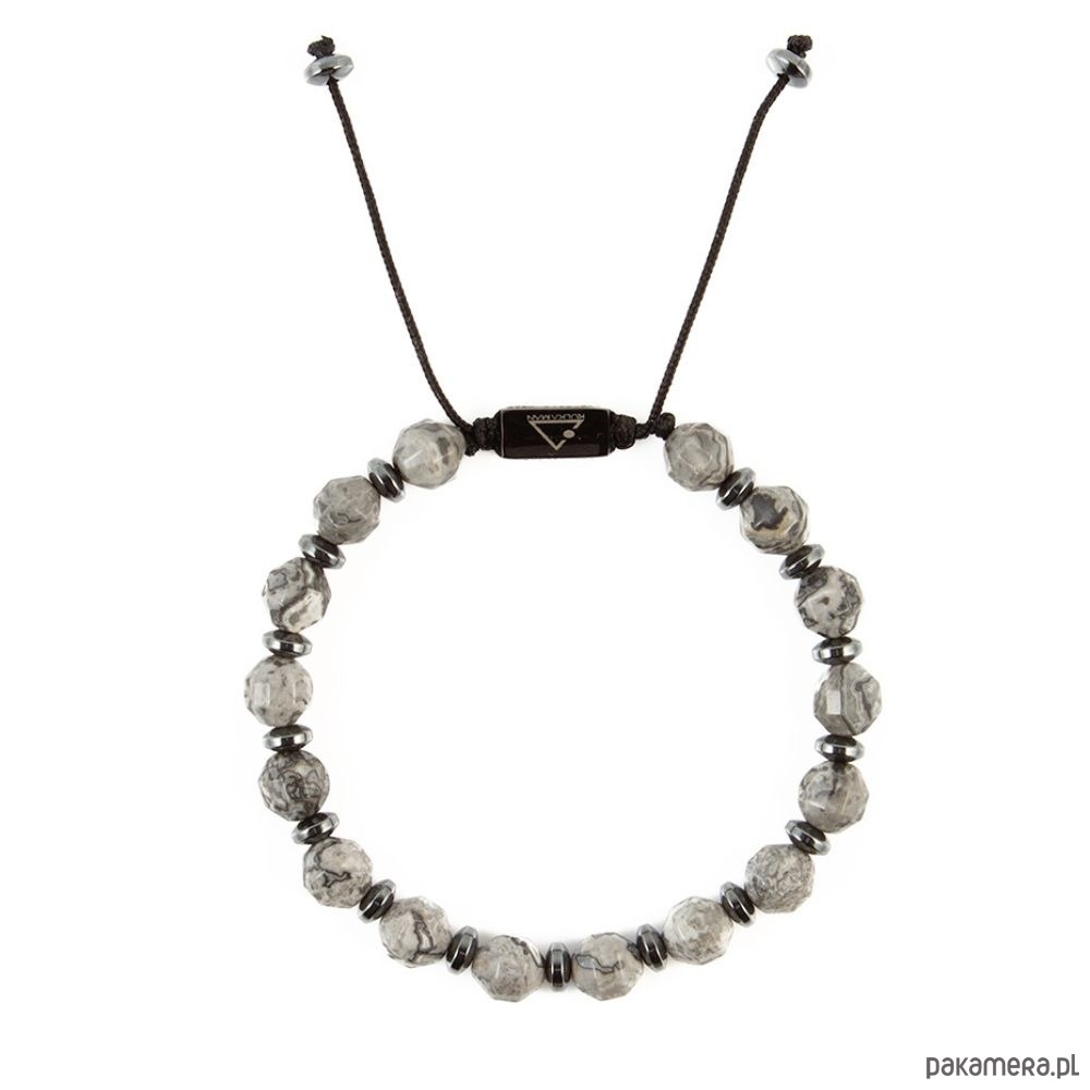 Męska bransoletka wykonana z naturalnego Agatu w odcieniach szarości o fasetowanej powierzchni, która subtelnie odbija światło i podkreśla unikalny charakter kamieni. Całość została uzupełniona grafitowymi elementami z Hematytu, nadającymi elegancji i mocniejszego, męskiego wyrazu. Bransoletka wykonana jest na czarnym sznurku regulowanym metodą plecionej makramy, dzięki czemu łatwo dopasowuje się do nadgarstka i zapewnia komfort noszenia. Centralnym akcentem jest stalowa kostka z grawerowanym logo marki, która dopełnia całość nowoczesnym detalem.