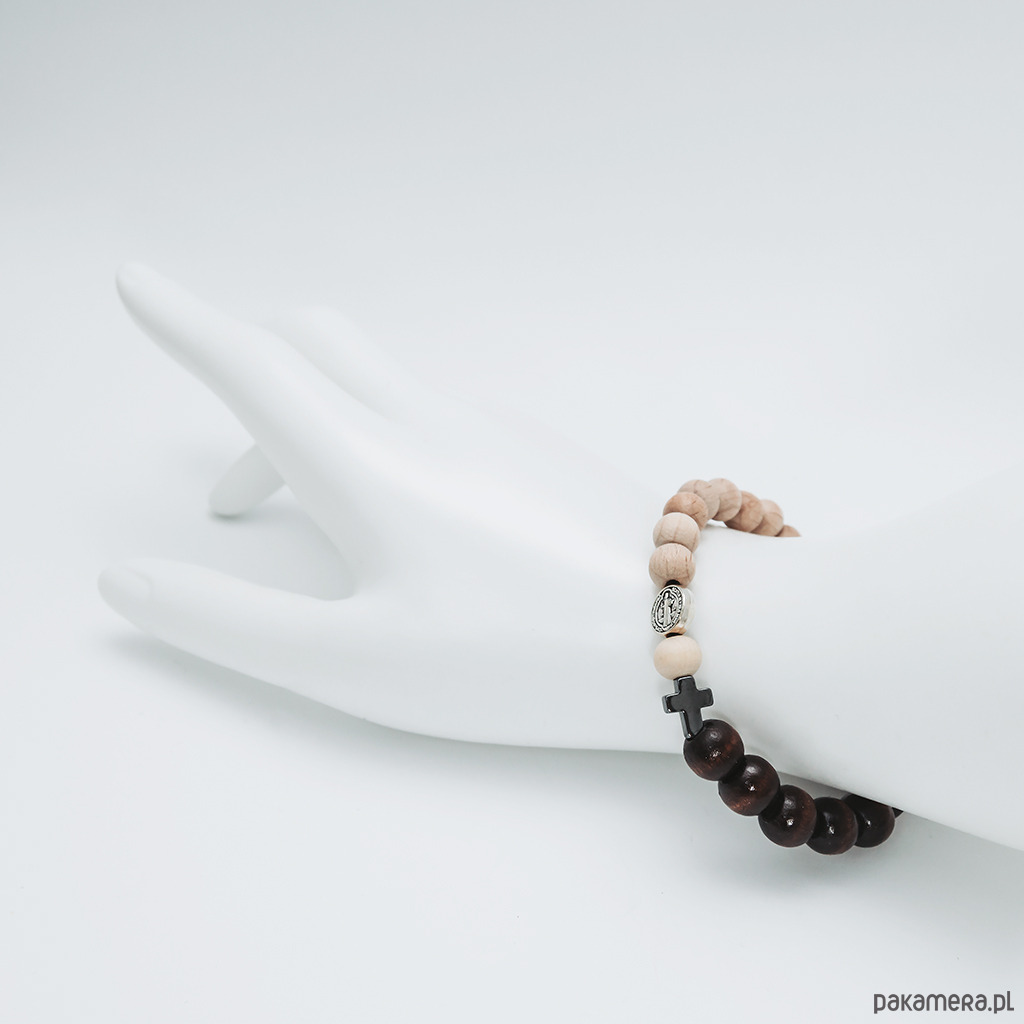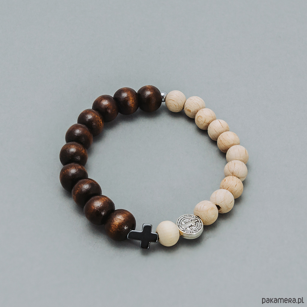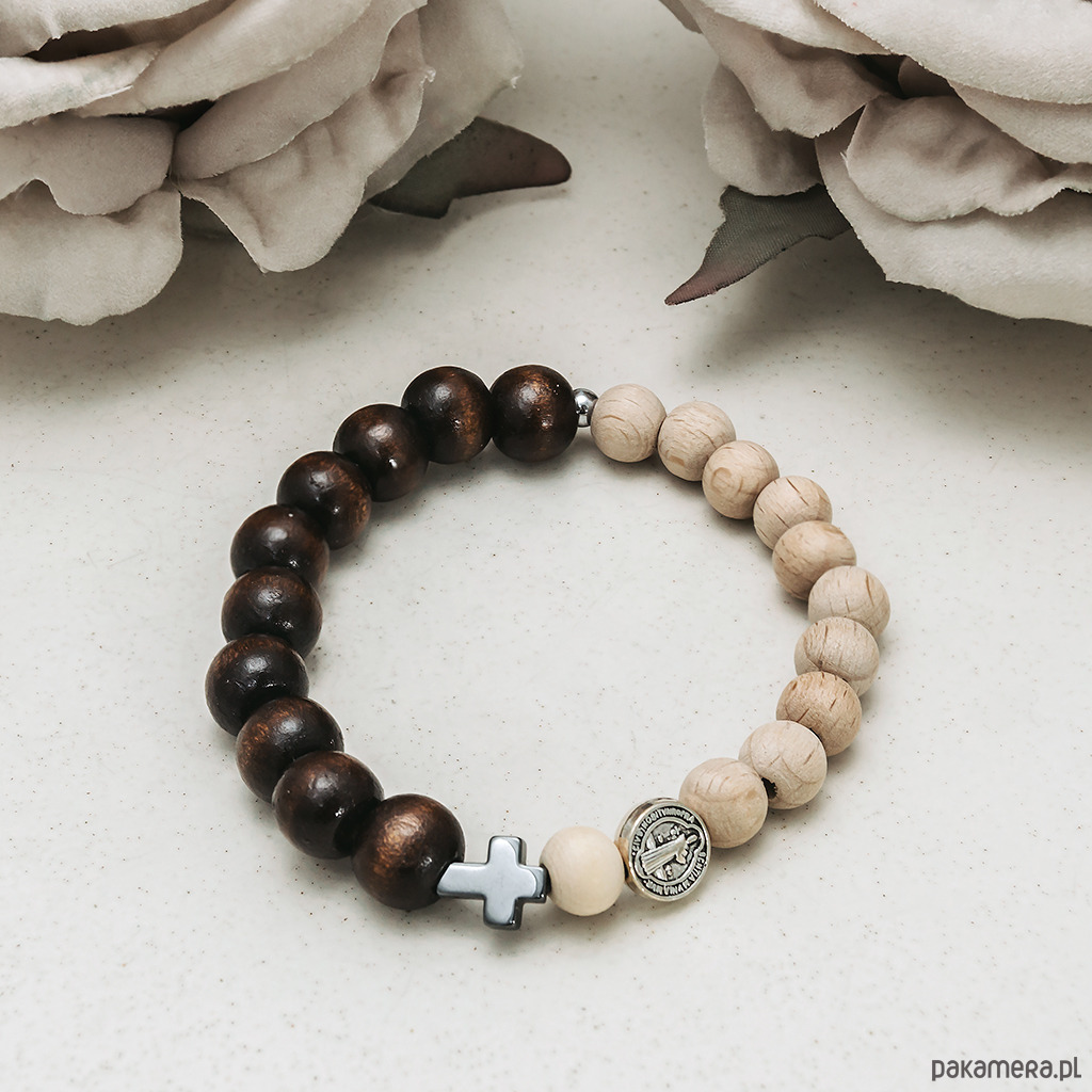 Ta piękna bransoletka - różaniec została wykonana z drewnianych koralików w kolorze brązowym i w kolorze naturalnego drewna, krzyżyka ze srebrzonego hematytu i medalika św. Benedykta w kolorze srebrnym.