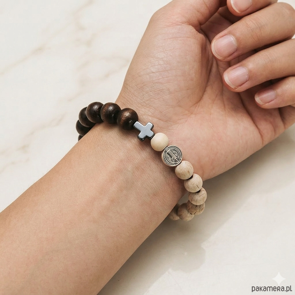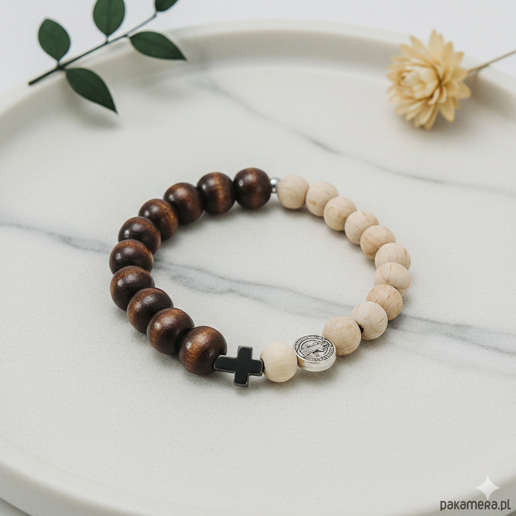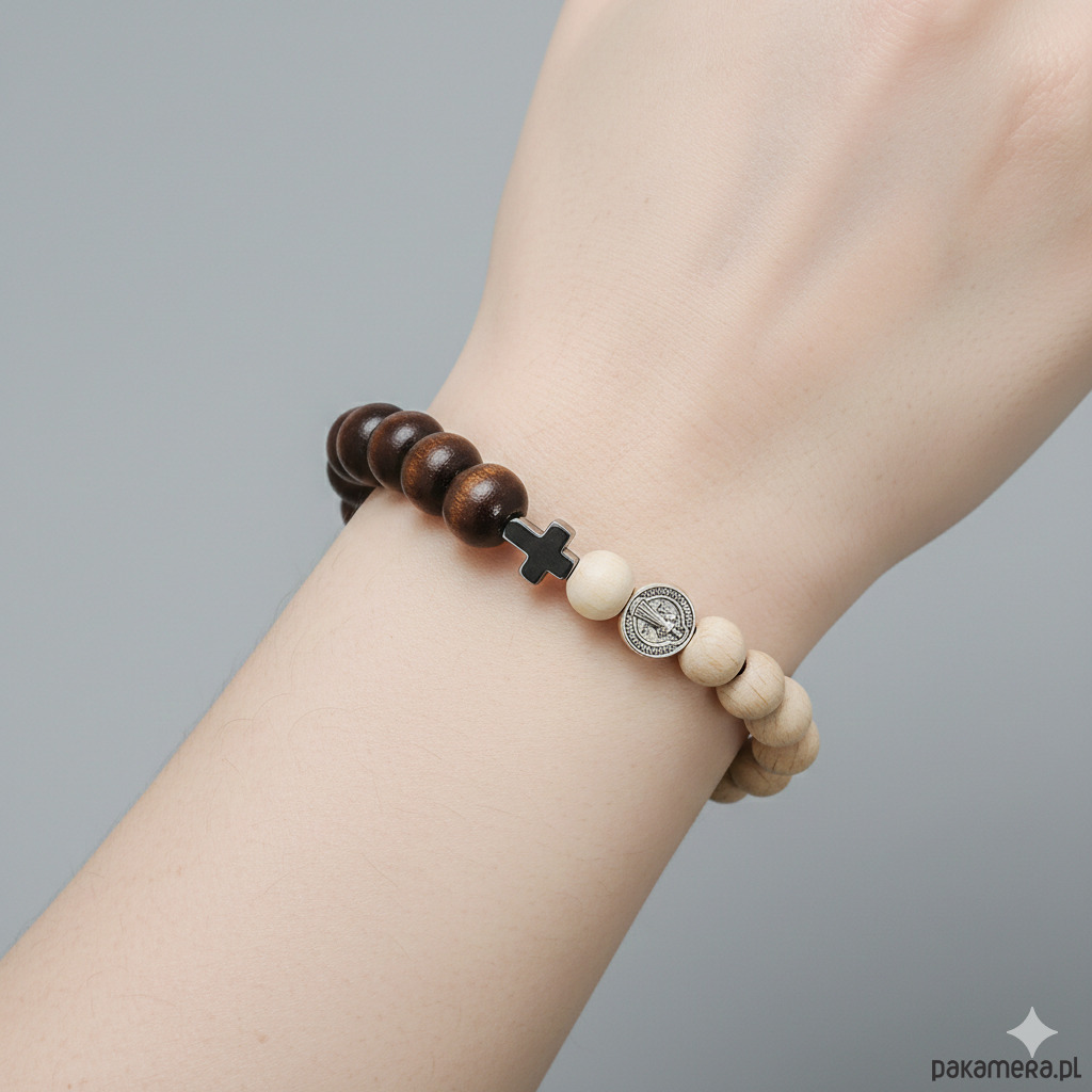 Ta piękna bransoletka - różaniec została wykonana z drewnianych koralików w kolorze brązowym i w kolorze naturalnego drewna, krzyżyka ze srebrzonego hematytu i medalika św. Benedykta w kolorze srebrnym.
