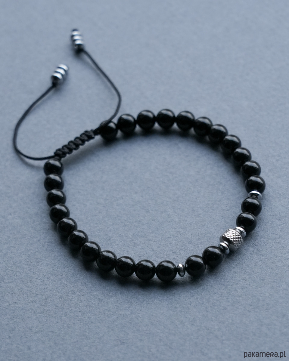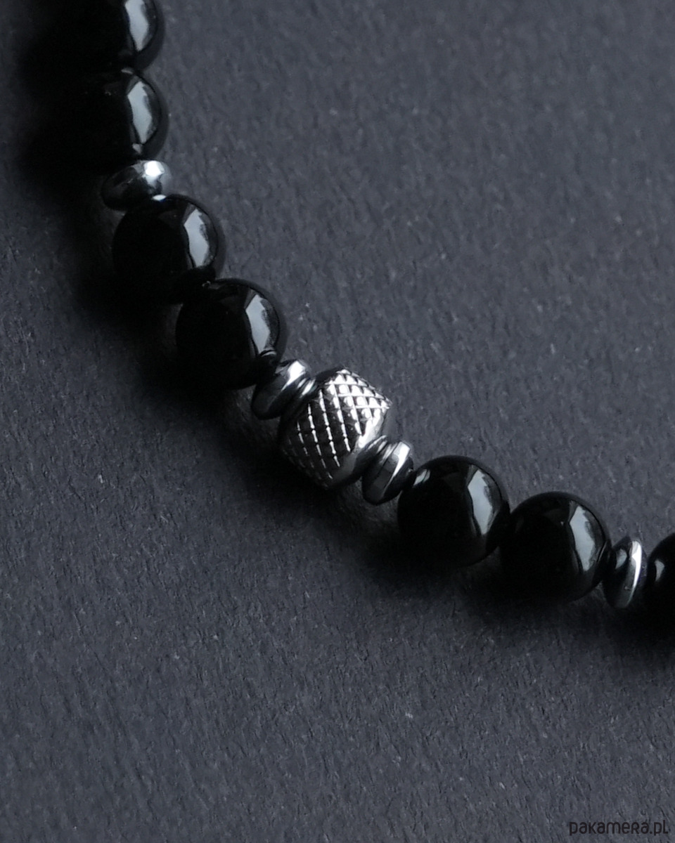 Męska, minimalistyczna bransoletka wykonana z czarnego ONYKSU i srebrnego HEMATYTU, której centralnym elementem jest ozdobny koralik ze srebrnej STALI SZLACHETNEJ. Posiada przesuwane "zapięcie" wykonane w technice makramy, dzięki czemu jest regulowana i ma uniwersalny rozmiar.